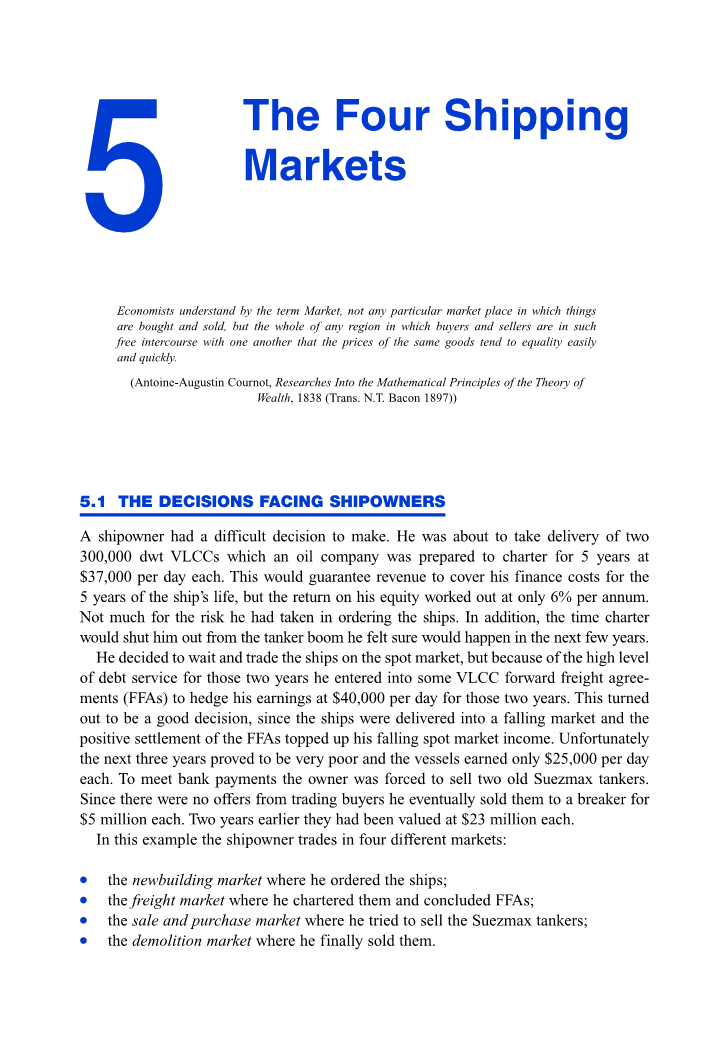今天,海运服务由四个密切相关的市场提供,每个市场交易的商品都不一样:海运货运市场;买卖市场买卖二手船舶;新建市场交易新的船舶;而拆船市场则以船舶报废为交易对象。除此之外,没有正式的结构。这是需要警告的重要一点。虽然本章提供这四个海运市场的运费加运费、运费加运费、运费加运费价格加运费价格指导市场如何运作,我们不是在处理不可改变的规律。交易员过去以特定方式行事的事实,并不能保证他们将来会这样做。因为市场是由人组成的,所以最好的商业机会往往出现在市场行为不一致的时候。例如,在市场周期的顶部订购船舶通常是不好的业务,但如果由于某种原因很少订购船舶,则该规则将不适用。商业判断必须基于对市场动态的理解,而不是断章取义的经济原则。