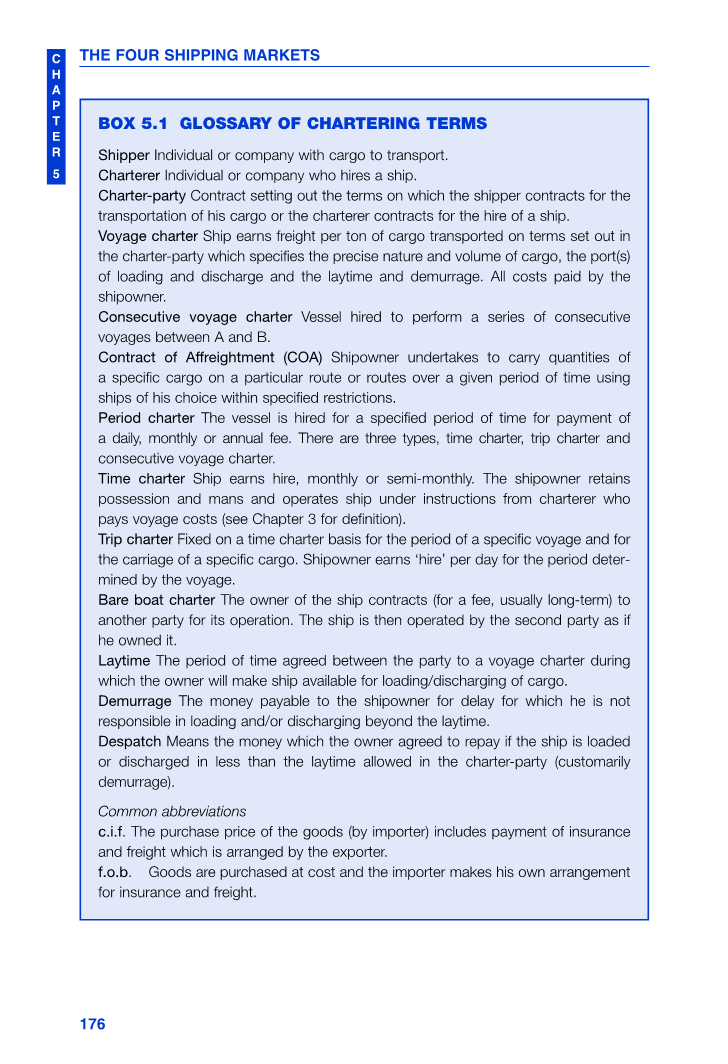 本章的目的是从实际的角度来解释这四个市场是如何运作的,并找出它们之间的区别。在第 4 章中,我们讨论了供需分析的基本内容,展示了供需曲线是如何相互作用来决定运费和价格的,所以现在我们要对这些内容进行补充。船舶实际上是如何租来的?FFAs 如何管理货运市场风险?买卖市场是如何运作的,又是什么决定了一艘船在特定时间点的价值?买一艘新船和买一艘二手船有什么区别?将一艘船作为废料出售与将其作为持续交易出售有何不同? 这些市场是如何相互作用的?对这些实际问题的理解,应该能让我们更深入地了解市场经济的真正运作方式。在这些市场中经常使用的更重要的专业术语列表见第 5.1 栏。