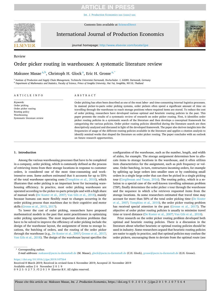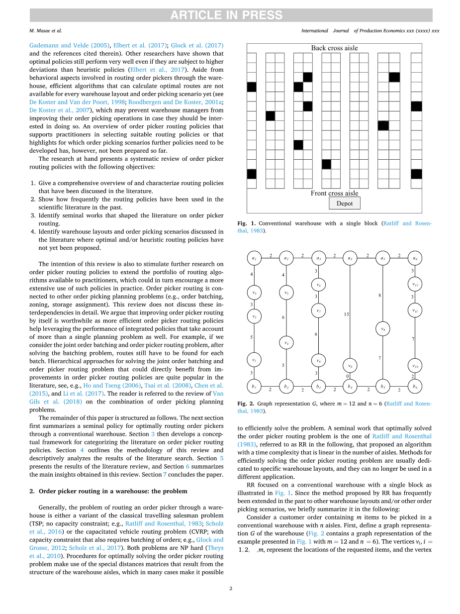 先前对订单拣选人员路径问题的研究最佳启发式路径策略。 有一个讨论关于应该采用启发式策略还是最佳路径策略的文献用于工业。 一些研究人员认为启发式路径策略更容易在实践中应用,而且最佳政策可能会使订单拣选者,鼓励他们偏离最佳路线(请参见Gademann和Velde(2005),Elbert等。(2017);格洛克等。(2017)以及其中引用的参考文献)。其他研究人员表明最优策略即使在更高级别下也仍然表现良好偏离启发式策略(Elbert et al。,2017)。除了在整个仓库中路径订单拣选人员的行为方面,可以计算最佳路线的有效算法不是目前可用于每种仓库布局和订单拣配场景(请参阅De Koster和Van der Poort,1998; Roodbergen和De Koster,2001a;De Koster等人,2007),这可能会阻止仓库经理改进他们的订单拣选操作,以防他们感兴趣在这样做。订单拣选人员路径策略概述支持从业人员选择合适的路径策略,或者突出显示哪些订单拣选方案需要进一步的政策但是,到目前为止尚未准备好开发的程序。当前的研究对订单拣选人员进行了系统的回顾具有以下目标的路径策略:1.全面概述并描述路径策略在文献中已经讨论过了。2.显示路径策略在路径器中的使用频率。过去的科学文献。3.确定影响订单拣选人员文献的开创性作品路径。4.确定仓库布局和拣货场景具有最佳和/或启发式路径策略的文献尚未提出。这次审查的目的还在于促进对订单拣选人员路径策略以扩展路径算法的产品组合提供给从业者,这反过来又可以鼓励更多在实践中广泛使用此类政策。订单拣选人员路径已连接其他订单拣选计划问题(例如,订单批处理,分区,存储分配)。这篇评论不讨论这些相互依存关系详细地。我们认为改进订单拣选人员路径本身是值得的,因为更高效的订单拣选人员路径策略帮助充分利用综合策略的性能不仅仅是一个计划问题。例如,如果我们考虑联合订单批处理和订单拣选人员路径问题,之后解决批次问题,仍然需要为每个路径找到路线批量。解决联合订单分批处理的分层方法可以直接从改进中受益的订单拣选人员路径问题为了使拣选人员路径策略在文献,参见例如Ho和Tseng(2006),Tsai等。 (2008),Chen等。(2015),以及Li等。 (2017)。读者可参考范的评论吉尔斯等。 (2018)关于订单拣配计划的组合问题。本文的其余部分的结构如下。下一节首先总结了最佳路线拣选人员的开创性策略通过常规仓库。然后,第3节提出了一个概念订单拣选人员路径文献分类框架政策。第4节概述了此次审核的方法,以及描述性地分析文献检索的结果。第5节提出文献综述的结果,第6节总结在这次审查中获得的主要见解。第7节总结了论文。