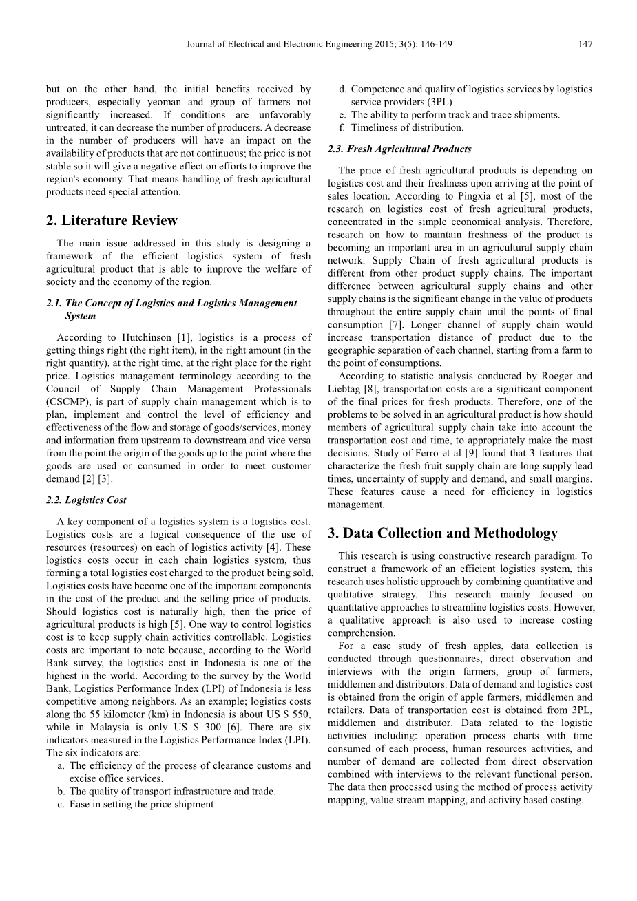 物流系统的一个关键组成部分是物流成本。物流成本是每个物流活动使用资源(资源)的逻辑结果(4)。这些物流成本发生在每个连锁物流系统中,因此形成了计入所销售产品的总物流成本。物流成本已经成为产品成本和产品销售价格的重要组成部分之一。如果物流成本自然高,那么农产品的价格就高(5)。控制物流成本的一个方法是保持供应链活动可控。物流成本值得注意,因为根据世界银行的调查,印度尼西亚的物流成本是世界上最高的之一。根据世界银行的调查,印度尼西亚的物流绩效指数(LPI)在邻国中竞争力较弱。举个例子。印尼55公里的物流成本约为550美元,而马来西亚仅为300美元(6)。物流绩效指数(LPI)有六个衡量指标。这六个指标是: