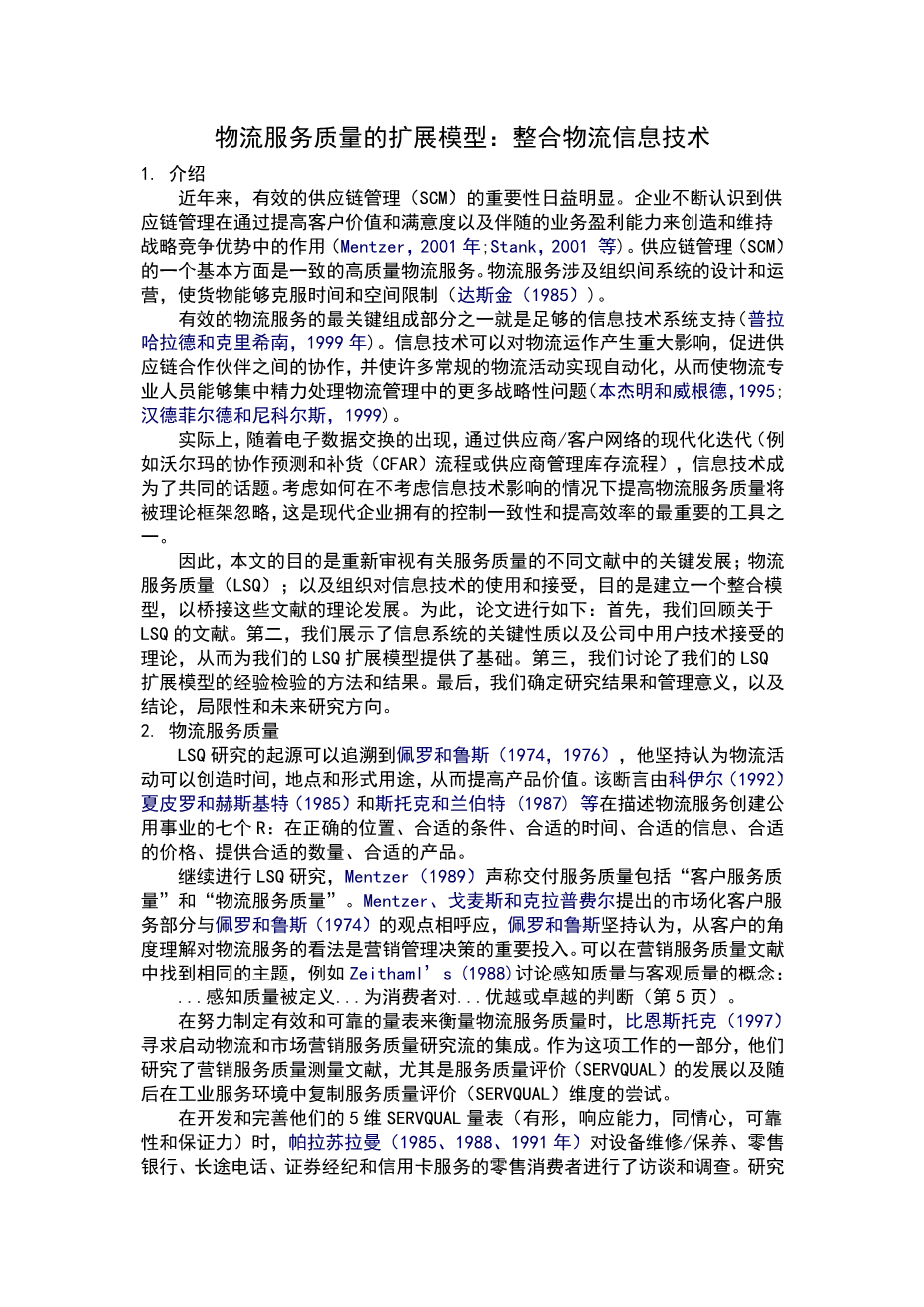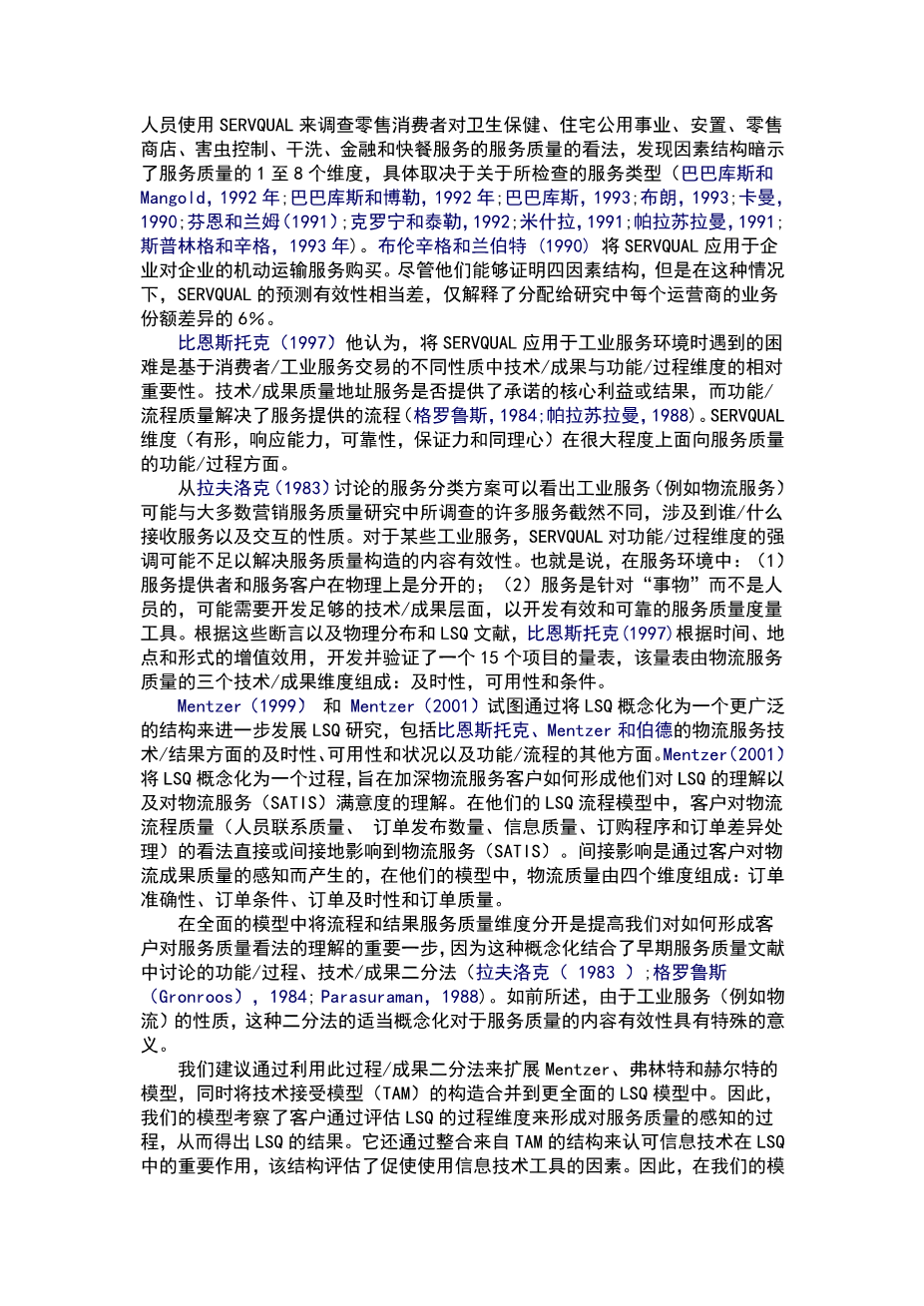 For this reason, the goal of this paper is to revisit key developments in the distinct bodies of literature on service quality; logistics service quality (LSQ); and organizational use and acceptance of information technology, with the objective of developing an integrative model that bridges the theoretical developments in these literature. To that end, the paper proceeds as follows: first we review literature on LSQ. Second, we demonstrate the critical nature of information systems and theories of user technology acceptance in the firm to provide the basis for our expanded model of LSQ. Third, we discuss the methodology and results of an empirical test of our expanded model of LSQ. Finally, we identify