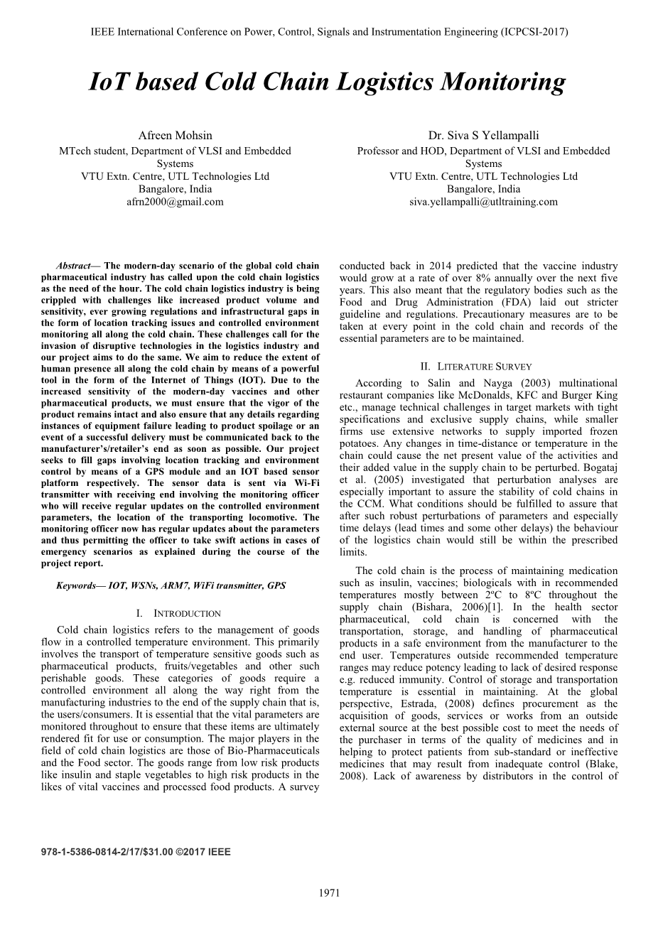 摘要:当今全球冷链制药行业的现状,反映出冷链物流问题亟待解决。冷链物流行业正在受到各种挑战的困扰,例如,不断壮大的产品数量和产品的敏感度增强、越来越多的法规以及在位置跟踪问题和整个冷链的受控环境监测方面存在的基础设施缺口。这些挑战需要有颠覆性技术入侵物流行业,这也是我们的项目旨在做到的地方。我们的目标是通过物联网(IOT)这一强有力的工具,减少人力工作在整个冷链上的存在程度。由于现代疫苗和其他医药产品的敏感性增强,我们必须保证产品的活性保持不变,同时确保任何关于设备故障导致产品变质或成功交付事件的细节必须尽快反馈给制造商或零售商。我们的项目试图通过GPS模块和基于物联网的传感器平台来填补位置跟踪和环境监控方面的空白。传感器数据通过Wi-Fi发送与接收端相连的发射机,包括监控员,他将定期收到所控制的环境参数、运输机车位置的最新信息。监控人员现在定期更新有关参数,从而使他能够在项目报告期间所述的紧急情况下迅速采取行动。