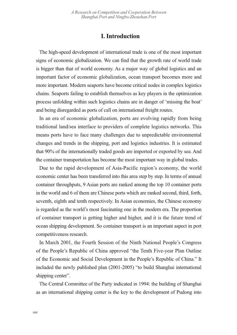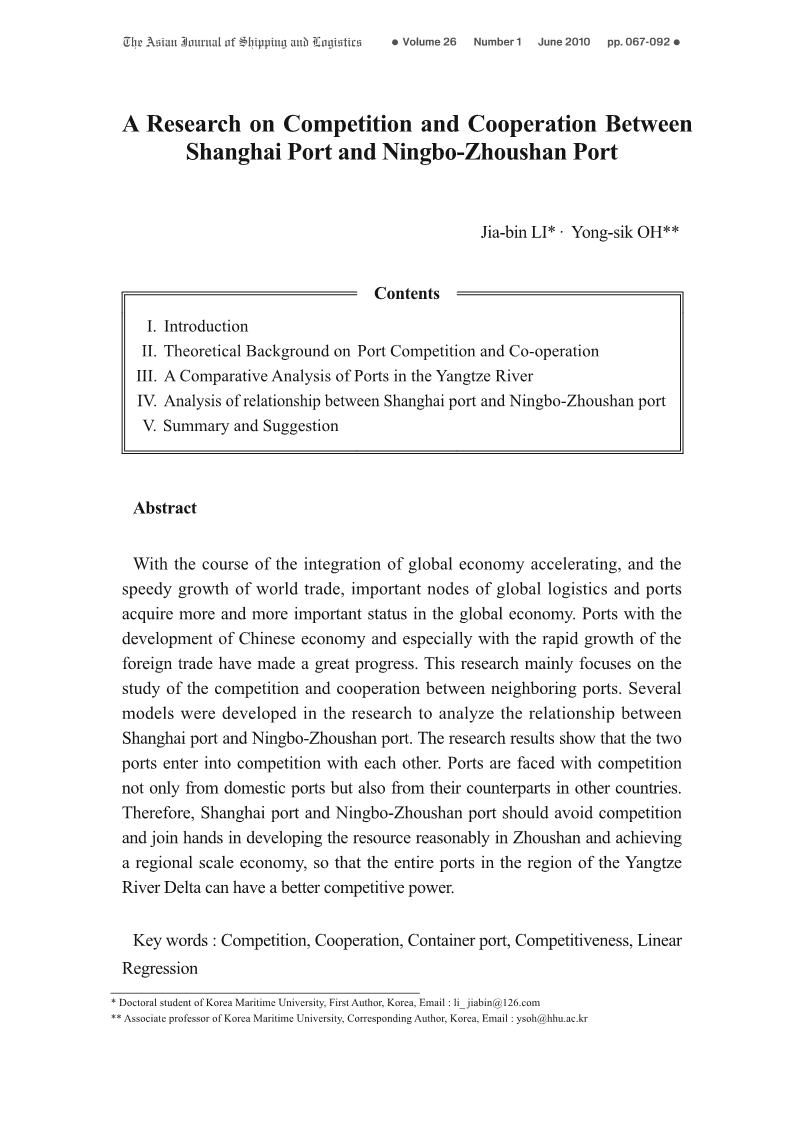 - 随着全球经济一体化进程的加快和世界贸易的快速增长,全球物流和港口的重要节点在全球经济中的地位越发重要。随着中国经济的发展,特别是对外贸易的快速增长,港口取得了很大的进步。本研究主要针对邻近港口之间的竞争与合作进行研究。研究中建立了若干模型来分析上海港与宁波-舟山港之间的关系。研究结果表明,这两个港口之间存在竞争关系。港口不仅面临着国内港口的竞争,也面临着其他国家港口的竞争。因此,上海港和宁波-舟山港应避免竞争,携手合作,合理开发舟山资源,实现区域规模经济,使整个长三角地区的港口具有更好的竞争力。