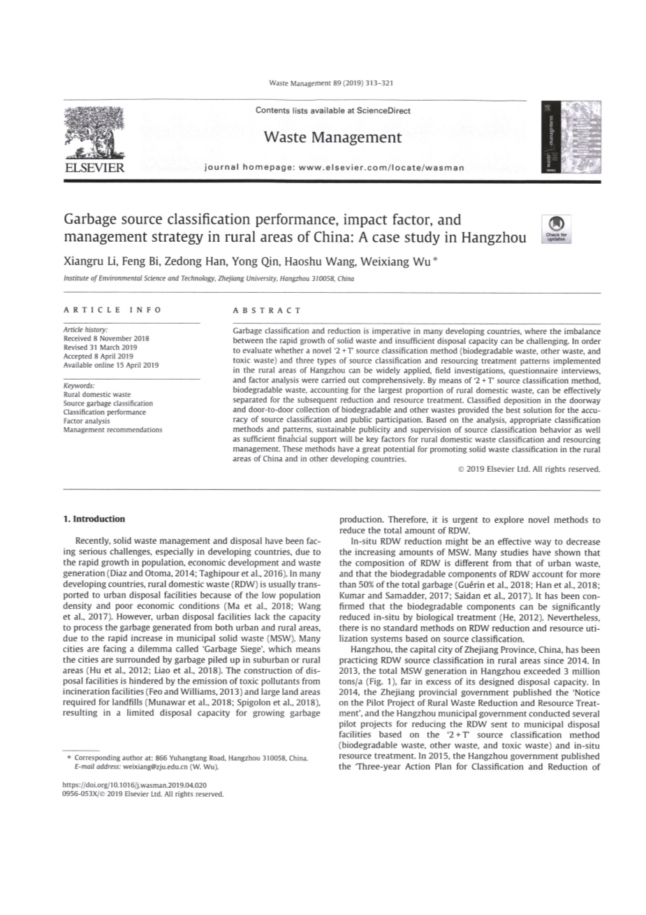 中国农村垃圾源分类绩效、影响因素及管理对策研究——以杭州市为例
