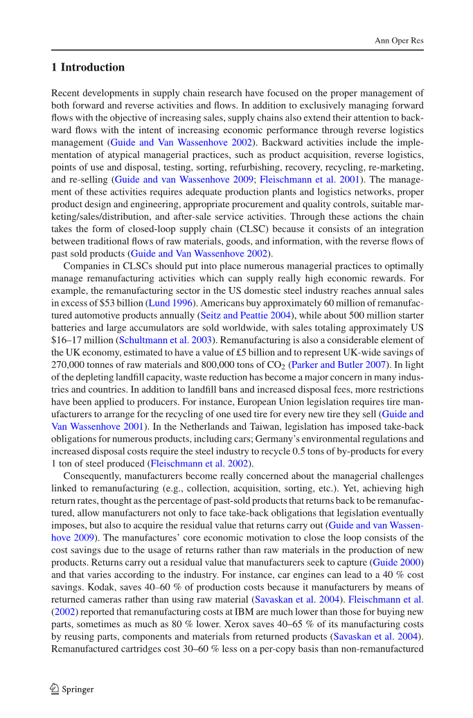 因此,制造商开始真正关注与再制造相关的管理挑战(例如收集、获取、分类等)。然而,Guide 和van Wassenhove(2009)发现实现高回报率(被认为是过去销售的产品返回再制造的比例)不仅使制造商面临法律强加的收回义务,而且还使他们获得返回所实现的剩余价值。制造商关闭这个循环的核心经济动机是由于在新产品的生产中使用回收品而不是原材料而节省的成本。Guide(2000)指出回报计算的是制造商试图获取的残值,而残值根据行业而异。例如,汽车引擎可以节省40%的成本。柯达,节省40-60%的生产成本,因为它的制造商通过返回相机而不是使用原材料。Fleischmann等(2002)报告称,IBM的再制造成本比购买新部件的成本低得多,有时甚至低80%。Savaskan(2004)报告称施乐通过回收产品的零部件和材料,节省了40%-65%的制造成本。再生粉盒的成本比非再生粉盒低30- 60%。Stopwaste网站数据显示TriNet一直在购买再生的墨盒,在五年内节省了新墨盒价格的25 - 60%。Interface公司是全球最大的商用地毯供应商。Agrawal和Tokay(2010)指出为了提高效率,公司决定租地毯而不是卖地毯;对到期产品的所有权给了Interface动机,以关闭循环并恢复这些产品的剩余价值。