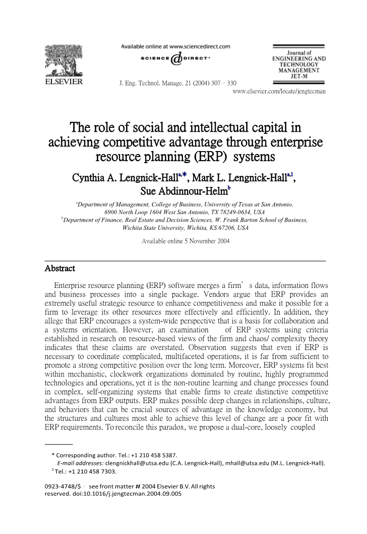 企业资源计划(ERP)软件将企业的数据、信息流和业务流程合并到一个单独的包中。供应商认为ERP提供了一种非常有用的战略资源来增强竞争力,使企业能够更有效地利用其他资源。此外,他们还声称,ERP鼓励用全系统的观点作为协作和系统导向的基础。然而,一项对ERP系统的研究表明,这些说法被夸大了,该研究使用了企业资源观和混沌/复杂性理论研究中建立的标准。观察表明,即使ERP对于协调复杂的、多方面的操作是必要的,但从长期看它是远远不够促进强大的竞争地位的。此外,ERP系统最适合于以常规、复杂编程的技术和操作为主的机械、时钟系统组织,然而,正是在复杂、自组织的系统中发现的非常规学习和变化过程,使企业能够从ERP的产出中获得独特的竞争优势。ERP使关系、文化和行为上的深层次变化成为可能,而这些可能是知识经济中重要的优势来源,但最能实现这种程度的变化的结构和文化与ERP的要求不太相符。为了解决这一矛盾,我们提出了一个双核、松散耦合的组织,该组织将ERP视为一种能够构建和增强社会和智力资本的技术,而不是一种针对组织效率低下的信息技术(IT)解决方案。提出了利用ERP作为社会资本和智力资本形成基础的设想。对研究和实践的意义进行了讨论。