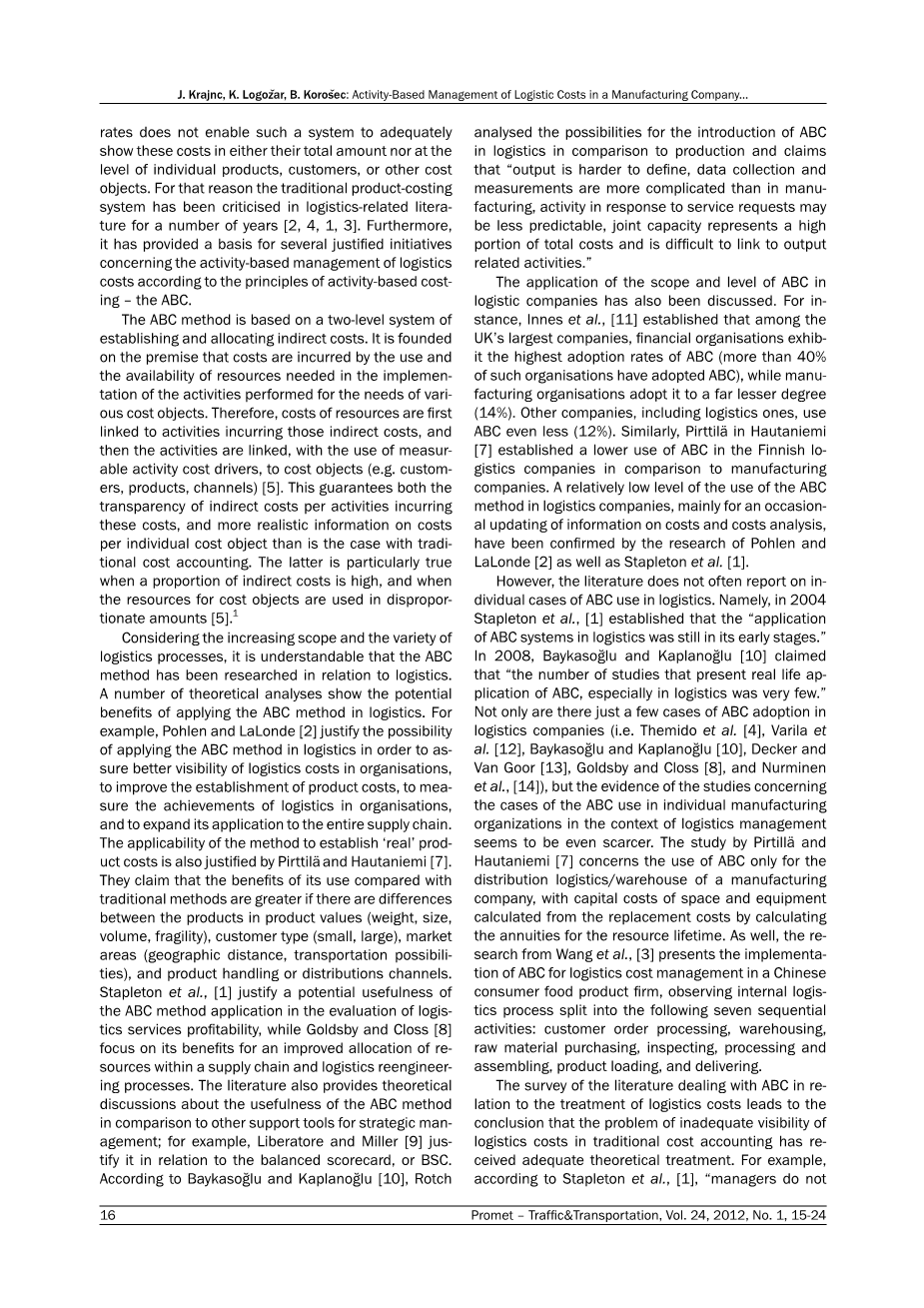考虑到物流的增长范围和物流流程的多样性,对作业成本法在物流中的应用进行研究是可以理解的。大量的理论分析表明了在物流中应用作业成本法的潜在好处。例如,Pohlen和LaLonde[2]证明了在物流中应用ABC方法的可能性,以便确保组织中物流成本的更好可见性,改进产品成本的建立,衡量组织中物流的成就,并将其应用到整个供应链。Pirttilauml;和Hautaniemi也证明了建立“实际”产品成本的方法的适用性[7]。他们声称,与传统方法相比,如果产品在产品价值(重量、大小、体积、易碎性)、客户类型(小、大)、市场区域(地理距离、运输可能性)以及产品处理或分销渠道方面存在差异,则使用该方法的好处更大。Stapleton等人,[1]证明了ABC方法应用于评估物流服务盈利能力的潜在用处,而Goldsby和Clossby[8]则将重点放在改进供应链内资源分配和物流重组过程的好处上。文献还提供了关于ABC方法与战略管理的其他支持工具相比的有用性的理论讨论;例如,Liberatore和Miller[9]证明它与平衡计分卡(BSC)有关。根据baykasoğlu和kaplanoğlu[10]的说法,roch分析了将作业成本法引入物流与生产相比的可能性,并声称“产量比制造业更难定义,数据收集和测量比制造业更复杂,响应服务请求的活动可能更难预测,联合产能占总成本的很高部分,很难与产出相关的活动联系起来。”
