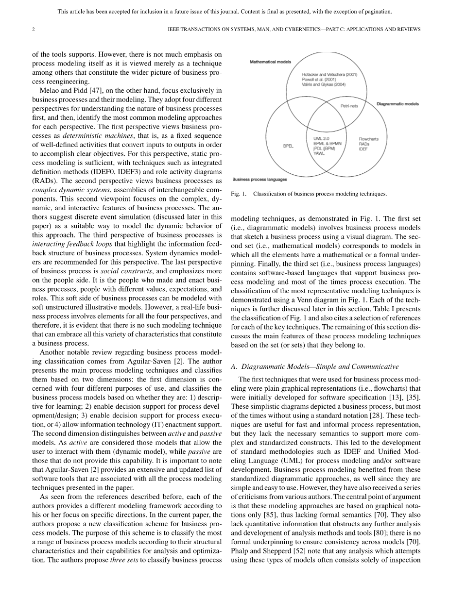 如前所述,每个作者根据其对特定方向的关注提供了不同的建模框架。在本文中,作者提出了一种新的业务过程模型分类方案。该方案的目的是根据业务流程模型的结构特征及其分析和优化能力,对大多数业务流程模型进行分类。作者提出了三套对业务流程进行分类的建模技术,如图1所示。第一组(即图表模型)涉及使用可视图表绘制业务流程的业务流程模型。第二组(即数学模型)对应于所有元素都有数学或形式上的牵制的模型。最后,第三组(即业务流程语言)包含支持业务流程建模和大多数情况下流程执行的基于软件的语言。最具代表性的建模技术的分类使用图1中的文氏图进行了演示。本节后面将进一步讨论每个技术问题。表1给出了图1的分类,并引用了每种关键技术的参考文献。本节的剩余部分讨论了这些基于它们所属集合的过程建模技术的主要特征。
