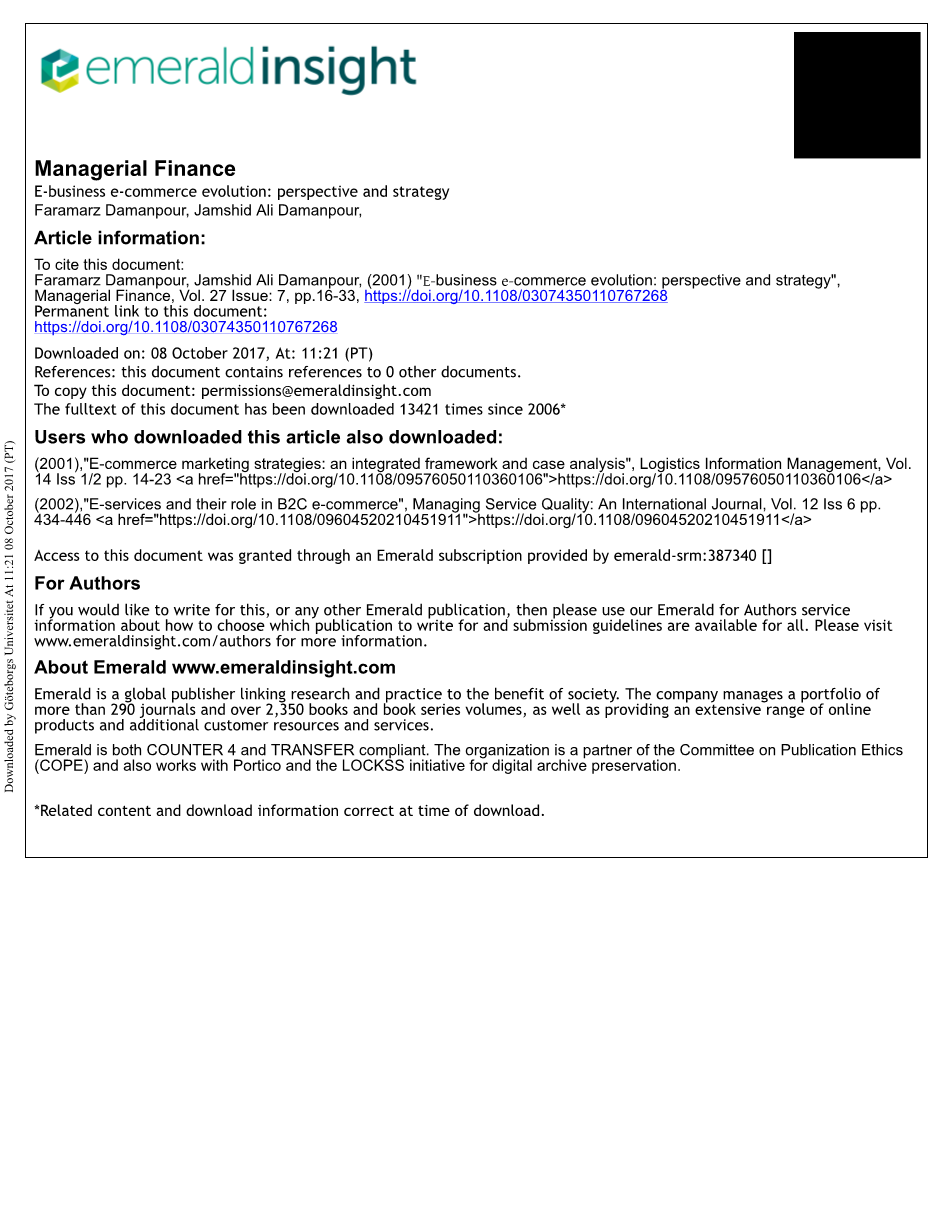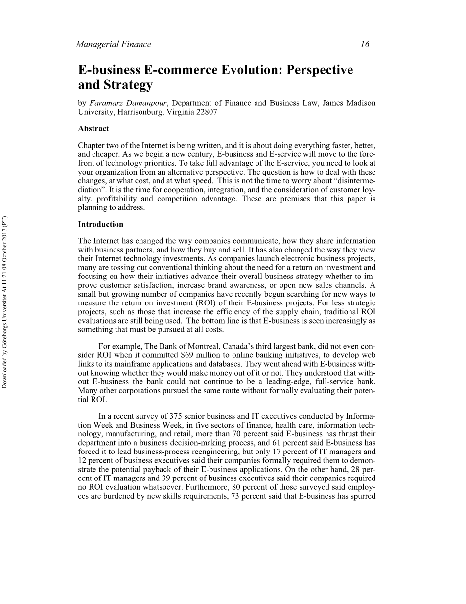 目的陈述本文的目的有八个方面。首先,从电子商务和电子商务的定义、应用和发展入手,提供了有关其成就的统计数据。接下来介绍了电子商务的驱动因素、目标、管理含义和模式。第三部分介绍了电子商务的四个方面:商业金融模型视角、关系视角、商业视角和响应视角。下一部分涉及电子商务的好处:更好的管理信息、更好的供应商和供应商整合、更好的渠道合作伙伴关系、更低的交易成本、更好的市场理解和扩大的地理覆盖范围。第五部分是关于电子商务和贸易的问题,讨论了与WTO和fta有关的互联网和电子商务问题。讨论包括一项关于如何通过互联网调整或改变全球贸易管理条例的七点建议。