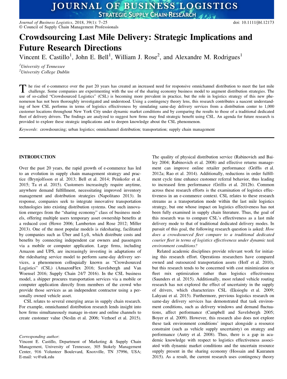 在过去的20年里,电子商务的快速增长导致了供应链管理战略和实践的演变(Brynjolfsson等人)。2013;钟等。2014;Peinkofer et al。2015;助教等。2015)。客户越来越需要随时随地的需求满足,这就需要改进库存管理和配送策略(Napolitano 2013)。作为回应,公司寻求将创新的运输技术整合到现有的配送系统中。其中一项创新产生于“共享经济”类的商业模式,以较低的成本为多个用户提供临时的资产所有权利益(Howe 2006;2012年;米勒2013年)。其中最受欢迎的一种模式是拼车,由优步(Ubereuro;)和Lyft等公司推动。这些公司通过移动或电脑应用,将独立车主和乘客联系起来,从而分配成本和收益。包括亚马逊(Amazon)和UPS在内的大公司正越来越多地投资于对拼车服务模式的改造,以提供当日送达服务,这种现象俗称“众包物流”(CSL) (AmazonFlex 2016;Savelsbergh和Van Woensel 2016;供应链24/7 2016)。在CSL业务模型中,托运人通过移动或计算机应用程序直接从人群成员处获取运输服务,这些人作为独立承包商使用个人拥有的车辆资产提供这些服务。