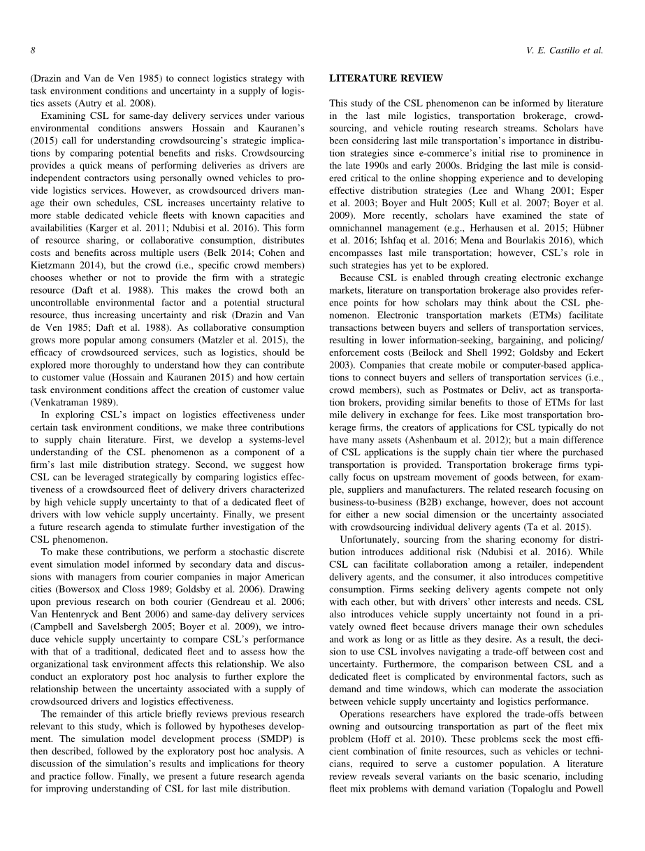 这篇文献回顾强调了我们对CSL的研究是如何建立在最后一英里物流、运输经纪、众包和车辆路径选择等供应链管理领域积累的研究基础上的。考虑CSL的公司应该考虑很多因素,比如供应管理策略的发展,以确保合适的众包司机的可用性,或者使用业余人员作为第一线员工的客户服务影响。然而,如果不了解CSL如何适应最后一英里分配策略,就无法有效地评估这些因素。该策略是基于众包司机团队相对于专用司机团队的表现。因此,我们提出假设,以更好地阐明在不同市场条件下使用众包车队对物流绩效的影响。