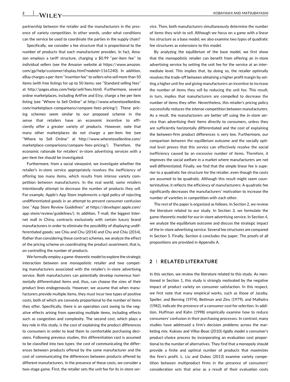 最后,值得一提的是,所有讨论店内广告效果的研究。许多实证研究都研究了店内陈列作为促销和广告工具的有效性。相比之下,Dukes 和 Liu(2010)对零售商提供的店内媒体服务对制造商之间的渠道协调的影响进行了理论研究,其动机与本研究相似。但是,尽管Dukes 和Liu(2010)考虑了零售商的店内服务为消费者提供有关单个产品的信息,但我们还是专注于零售商的服务,该服务可以帮助购物者比较多个产品以找到最合适的产品。因此,与DukesandLiu(2010)不同,我们明确地结合了我们的模型来评估多个产品的成本,该成本与所售产品的数量成正比。此外,我们调查了这种类型的店内服务对多产品制造商之间的品种竞争的有效性。这与Dukes和Liu的工作不同,后者主要分析垄断制造商和零售商之间的战略互动。此外,他们只考虑二次收取店内服务费。在这里,我们还讨论了费用结构的其他类型,并表明简单的线性费用结构优于二次费用结构。