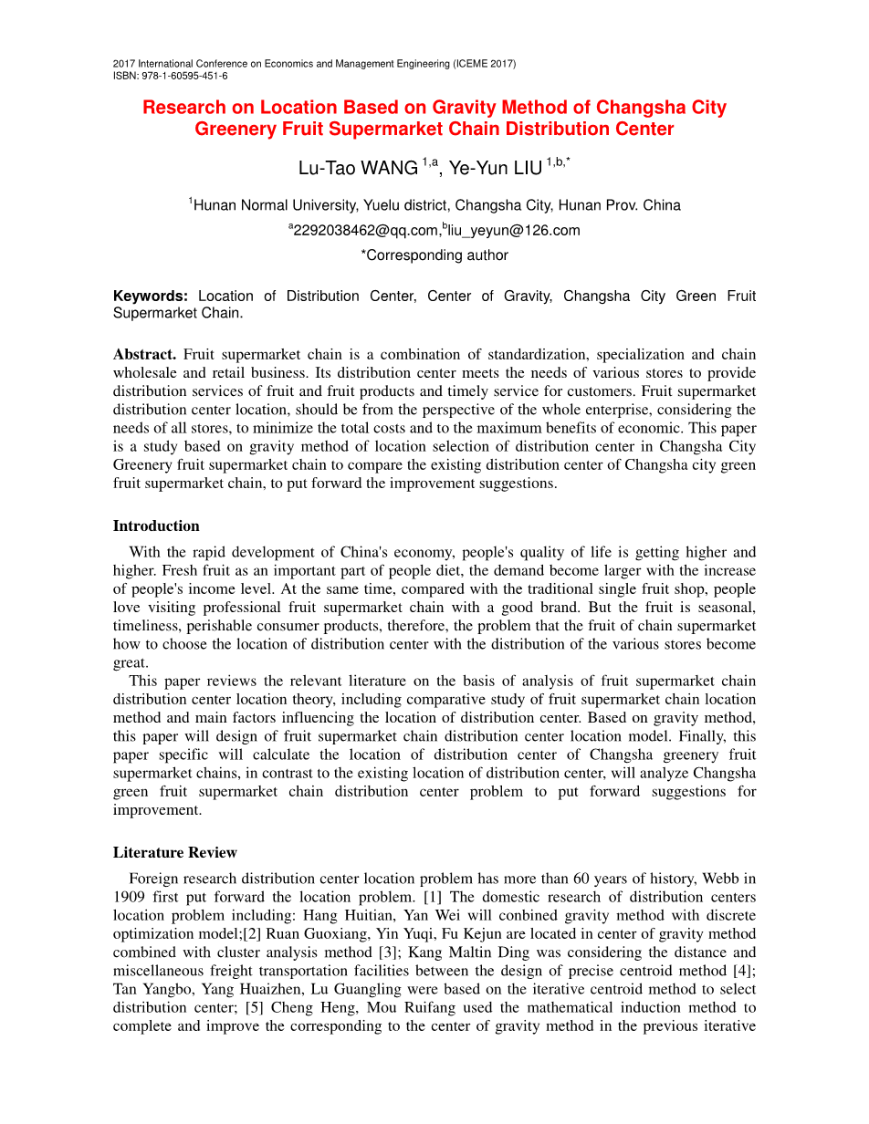 Keywords: Location of Distribution Center, Center of Gravity, Changsha City Green Fruit Supermarket Chain.