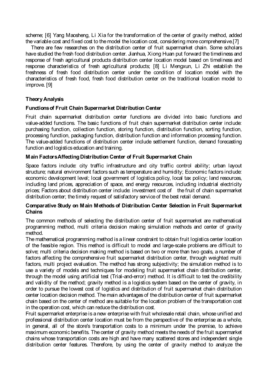 With the rapid development of Chinas economy, peoples quality of life is getting higher and higher. Fresh fruit as an important part of people diet, the demand become larger with the increase of peoples income level. At the same time, compared with the traditional single fruit shop, people love visiting professional fruit supermarket chain with a good brand. But the fruit is seasonal, timeliness, perishable consumer products, therefore, the problem that the fruit of chain supermarket how to choose the location of distribution center with the distribution of the various stores become great.
