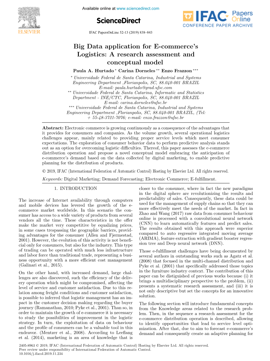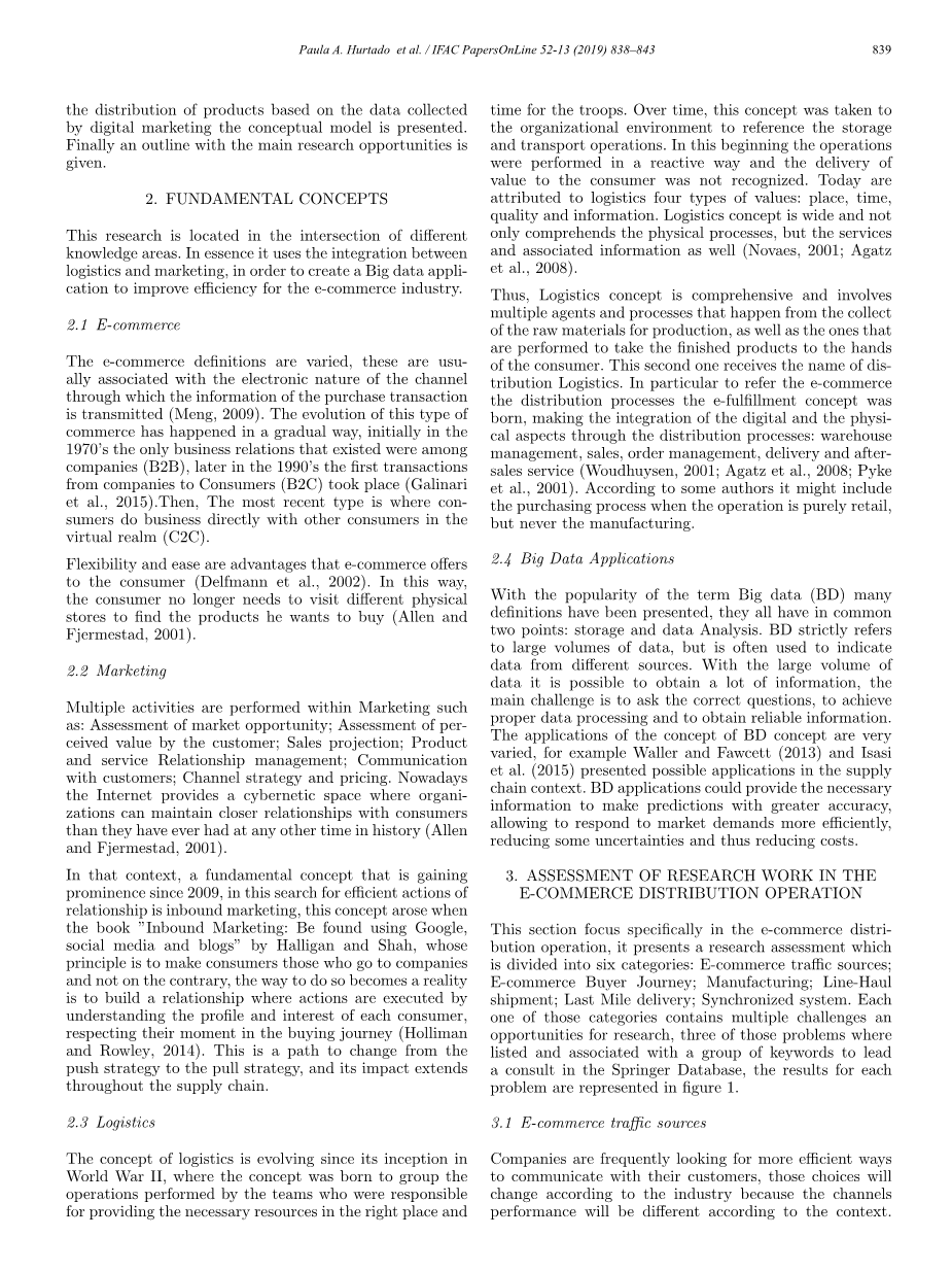 下一节将介绍与研究问题相关的知识领域中的基本概念。然后,在序列中描述了对电子商务配送操作的研究评估,允许识别导致服务水平优化的机会。在此基础上,针对电子商务的需求进行预测,从而制定相应的规划提出了基于数字营销收集的数据进行产品分销的概念模型。最后给出了主要研究机会的概述。