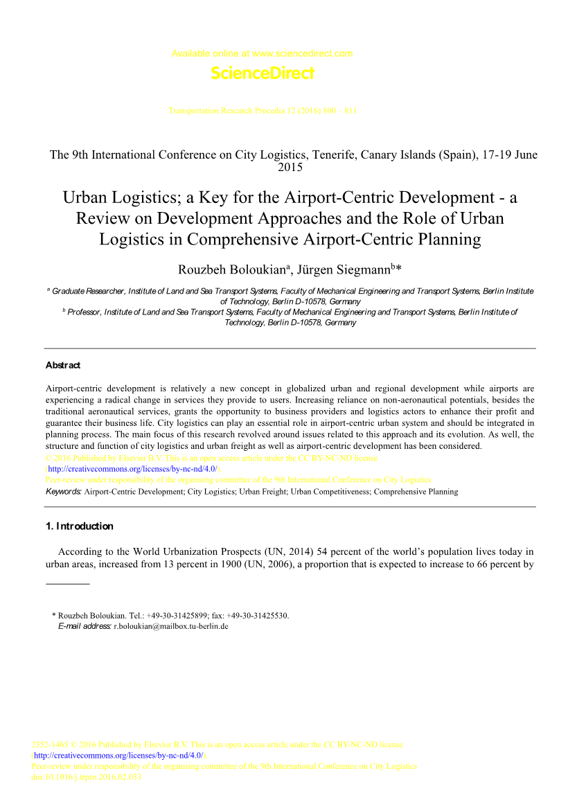 当空港正在经历提供彻底的服务上的改变,以空港为中心的发展在全球城市和区域发展中是比较新的概念。对非航空的潜力的依赖正在增长,以及传统的航空服务,正在积聚机会给商业供应商和物流参与者,以提高他们的利润和保证他们的商业运作。城市物流在以空港为中心的城市系统中扮演了重要的角色,由此需要被综合规划。本研究的重点是围绕这一方法及其演化出的相关问题。同时,城市物流结构和功能以及城市货运也和空港中心发展一样被考虑其中。
