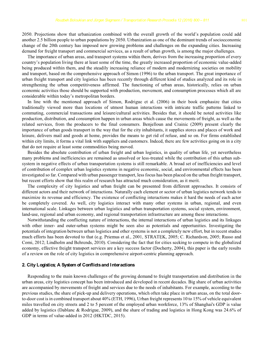 尽管有相互冲突的性质,城市物流及其关联的其他内部或者外部的城市系统的内部相互作用,可能被视为潜力和机会。调查城市物流和其他系统的整合潜力不是一个全新的努力,但在最近的研究中,人们一直致力于此。(例如Priemus等, 2001, STRATEK, 2005; C。 Richardson, 2005; Russo and Comi, 2012; Lindholm and Behrends, 2010)。考虑到在经济全球化中寻求竞争的城市,有效的货运服务是一个关键的成功因素(Docherty, 2004),本文是回顾了这一个研究的早期结果,即城市物流在综合以空港为中心的规划方法中的作用。