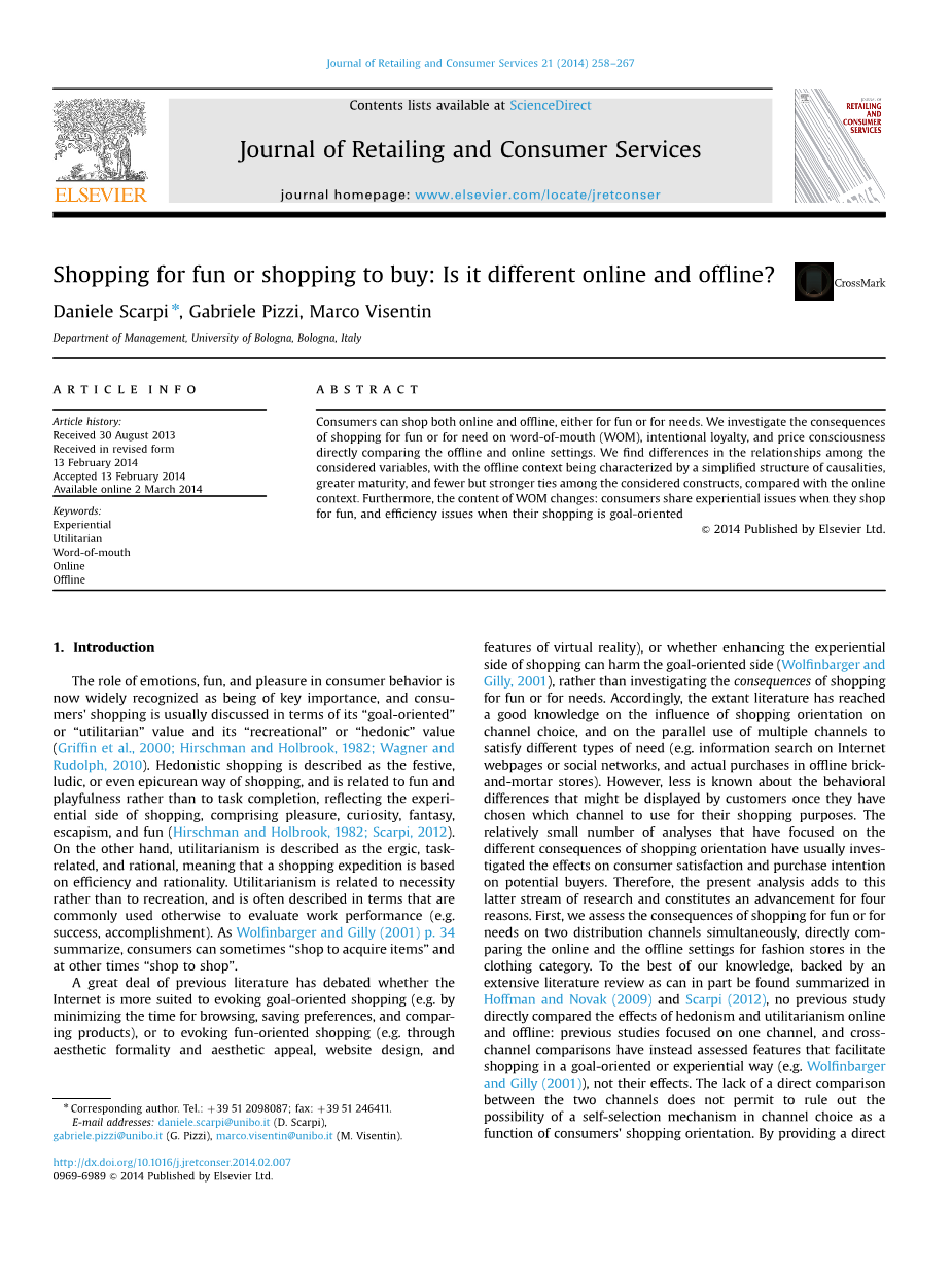 以往的大量文献已经证明互联网是否更适合引起有目标的购物(如最小化的时间浏览,节约优先,产品比较),或引起乐趣购物(例如,通过审美形式和审美情趣,网站的设计,和虚拟现实的特点),互联网增强改变购物目标的体验,而不是购物调查的意义。因此,现存的文献已形成对购物选择的良好作用,并且同时提供多种选择以满足不同的需求。(例如在网络或社会网络上搜索一些信息,并在实体店购买)。然而,很少有人知道顾客所表现的一些行为是用来实现他们购物目的的渠道。因此,目前的分析增加了研究的流向,并构成了四向发展。首先,我们评估购物是为了乐趣还是需要这两个销售渠道的结果,直接比较线上线下环境的时装店时装类别。据我们所知,由霍夫曼和诺瓦克以及斯卡尔皮总结的广泛的文献支持来看,之前的研究没有直接比较线上线上的享乐主义和功利主义:以前的研究主要集中在一个渠道上,交叉渠道的比较已经替代促进目标导向和体验方式的功能比较,而不是它们的影响。缺乏直接比较的两个渠道之间不能排除自我选择机智作为一个消费者倾向的可能性。通过提供线上线下渠道的直接比较,这篇文章目的是了解当消费者在它们不同的渠道中进行购物时享乐主义和功利主义的不同以及评估两个渠道的行为后果。