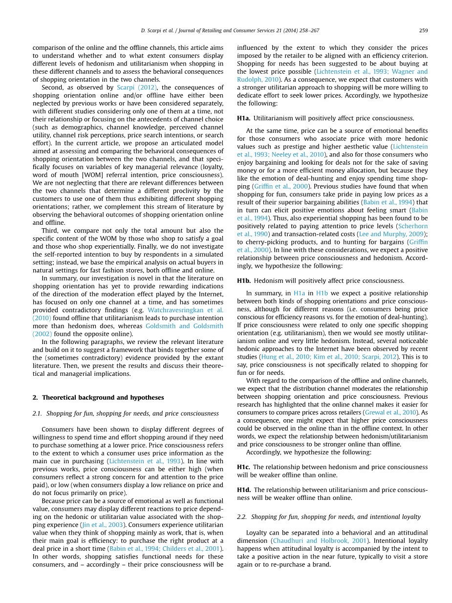综上所述,虽然出于不同的原因,我们还是期待这两种购物取向和价格意识之间的正相关。如果价格意识只跟一种购物取向相关,我们会预见大部分的功利主义而很少的享乐主义。相反,由最近的网络调查观察到很多明显的享乐主义。所以说,价格意识不一定是跟乐趣或者需要哪一个具体相关。关于比较线上线下渠道,我们期待渠道建立会缓和购物取向和价格意识之间的关系。以前的研究强调,线上渠道使消费者更容易比较不同零售商的价格。因此,更多的人可能更期待可以在网上观察到价格意识而不是在线下。也就是说,我们期待享乐主义和功利主义的关系,价格意识在线上比线下更加强大。