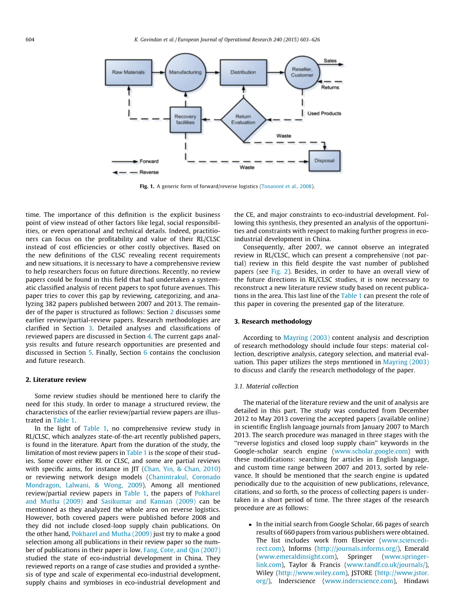 在表1,逆向物流和闭环供应链没有全面的回顾性研究,主要分析了国际上最近发表的论文。除了研究的持续时间外,表1中大多数论文的局限性在于他们研究的范围。例如一些论文只研究逆向物流模型,和一些有针对性的部分评论,例如JIT 或回收网络设计模型。Pokharel 等的论文对逆向物流的进行了全区域分析。然而,这两个涵盖的论文发表在2008之前,他们没有包括闭环供应链出版物。另一方面,Pokharel等试着在他们的文章中在所有出版物中做出一个好的选择。Fang等研究了在中国的生态工业发展状况。他们回顾了一系列案例研究报告,提供了一种适应生态工业的发展规模、满足未来生态工业发展要求合成型经济工业发展模式,在中国的生态工业发展不断进步的制约因素分析得到的这种多元的合成模式。