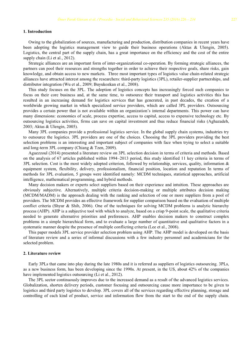 本文使用层次分析法来解决第三方物流服务供应商的选择问题。本文中的层次分析法模型的建立是基于相关的文献综述以及一部分学者研究的选择问题。