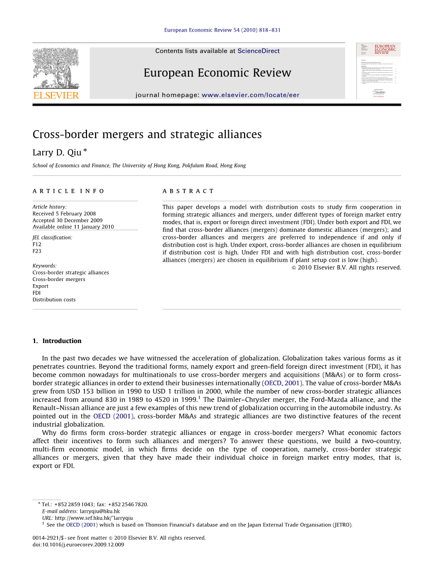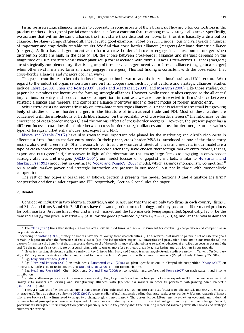 虽然目前还没有关于跨境战略联盟的系统研究,但我们的论文与国际贸易和外国直接投资文献中有关跨国并购研究的小规模但日益增多的研究有关。 这些研究大多涉及贸易自由化对跨国并购的盈利能力的影响,4 跨国并购出现的理由,5以及跨国并购的各种影响6然而,本文的重点不同:它研究了在各种外国市场进入模式(即出口和外国直接投资)下跨国战略联盟与跨国兼并的选择。