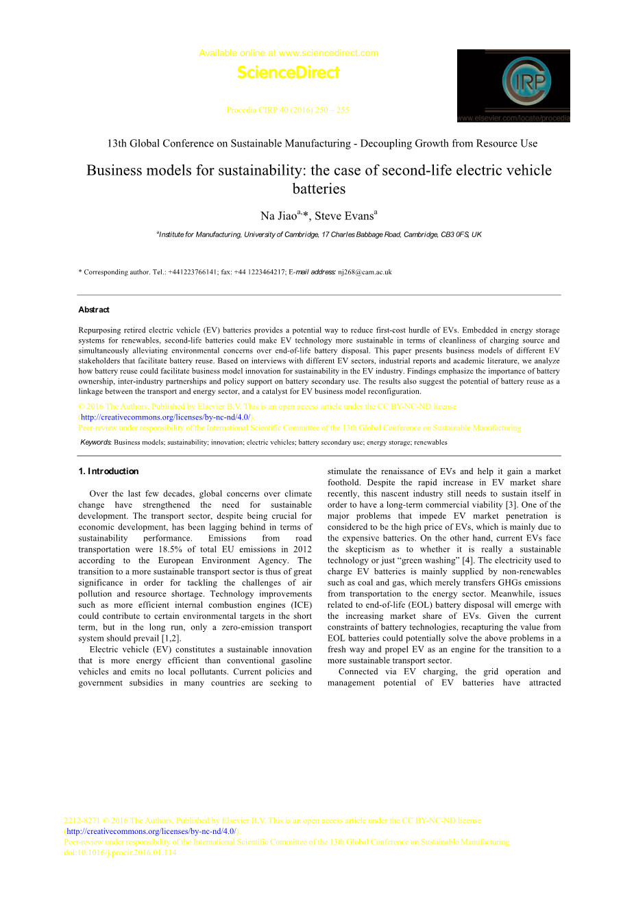 可持续发展的商业模式:再利用电动汽车电池的案例研究外文翻译资料