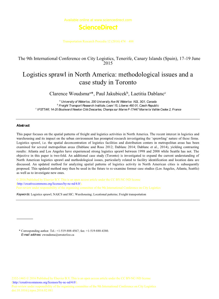 加拿大的案例研究(多伦多)调查了当前的北美物流的扩张。加拿大的角度研究出了带来一个有趣的美国研究之外,加拿大城市在许多方面都是相似的(一般城市形态,经济结构)和不同的在几个方面,比如更严格的土地用途管制。