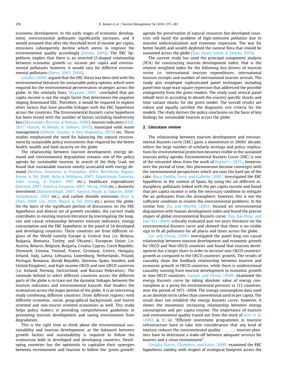 旅游开发与环境库兹涅茨曲线(EKC)之间的关系在20世纪20年代得到了发展,在持续的旅游政策议程中,大量的学术着作和环境保护的政策意义变得明显。环境库兹涅茨曲线(EKC)是库兹内特(1955)工作中提取的思想之一,然而,在一段时间内,这种现象变得与环境观点趋同,现在环境观点已经成为蛋糕的硬饼。Roca,Padilla,Farre和Galletto(2001)研究了EKC在西班牙的背景下,通过使用六种不同的大气污染物与人均收入相关联并发现人均收入只是缓解的必要条件来自大气的空气污染物; 但是,这不是解决环境问题的充分条件。 在里面类似的路线,Jha和Murthy(2003)专注于人类发展指数的环境退化,并发现了全球环境库兹涅茨曲线的精确形状。Dan,Kai-Peng和Jian-Xin(2004)对过去十年关于环境库兹涅茨曲线的文献进行了批判性评估,结果表明,全球所有地方和时间都没有明显的污染物标志。
