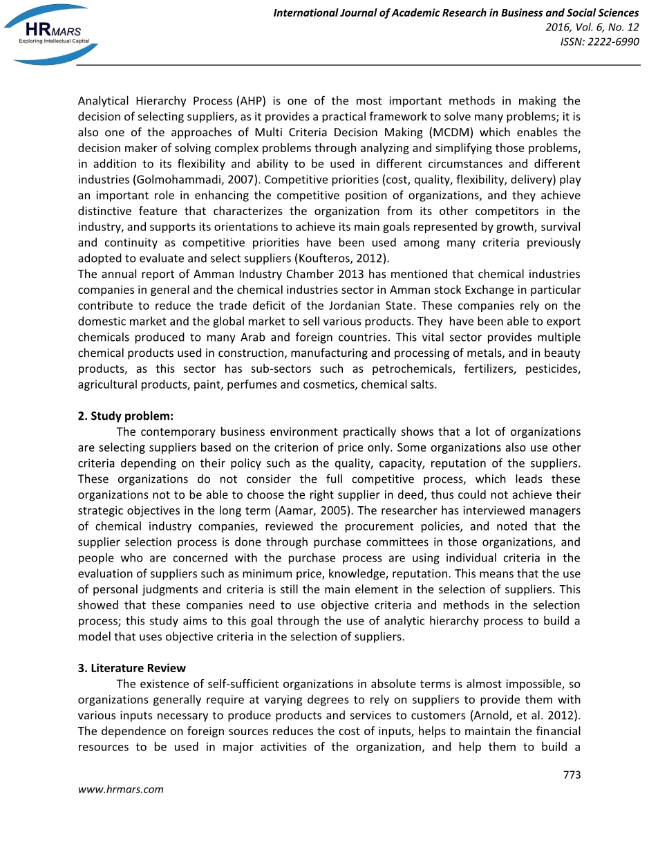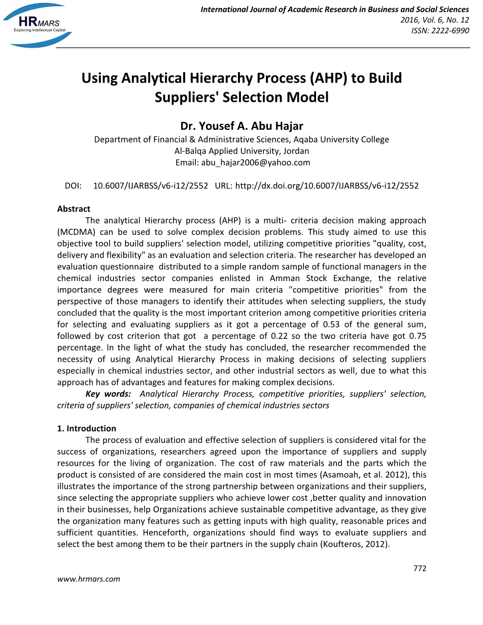 当代的商业环境实际上表明,许多组织仅根据价格标准来选择供应商。一些组织还根据其政策使用其他标准,例如质量,容量,供应商信誉。这些组织没有考虑完整的竞争过程,这导致这些组织无法按契约选择合适的供应商,因此长期无法实现其战略目标(Aamar,2005)。研究人员采访了化工公司的经理,审查了采购政策,并指出,供应商的选择过程是通过这些组织中的采购委员会完成的,与采购过程有关的人员正在使用个别标准来评估供应商,例如:最低价格,知识,声誉。这意味着使用个人判断和标准仍然是选择供应商的主要内容。这表明这些公司在选择过程中需要使用客观的标准和方法。这项研究旨在通过使用层次分析法来建立一个模型,该模型在选择供应商时使用客观标准。