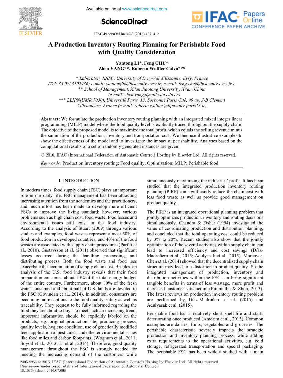 关键词:生产库存路由; 食品质量; 优化;MILP; 易腐食品
