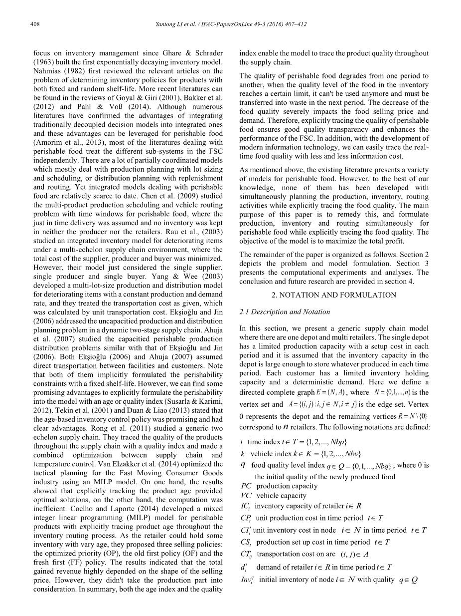 易腐食品的保质期相对较短,一旦生产就开始恶化(Amorim等,2013)。 常见的例子有乳制品,水果,蔬菜和杂货。 易腐坏的特性严重影响了战略生产和库存规划过程,同时为操作活动增加了额外的要求,例如, 冷库,冷藏运输和特殊包装。 易腐坏的FSC已被广泛研究与主要自从Ghare&Schrader(1963)建立了第一个指数级衰减库存模型以来,专注于库存管理。Nahmias(1982)首先回顾了有关确定具有固定和随机保质期的产品库存政策问题的相关条款。最近的文献可以在Goyal&Giri(2001),Bakker等人的评论中找到。(2012)和Pahl&Voszlig;(2014)。尽管许多文献证实了将传统的解耦决策模型整合到一体的优势,这些优势可以用于易腐食品(Amorim et al,2013),但大部分涉及易腐食品的文献都是针对不同的子系统FSC独立。有很多部分协调的模式,主要处理生产计划与批量和调度,或分配计划与补充和路由。然而,迄今为止,处理易腐食品的综合模式相对较少。 Chen et al(2009)研究了易于食用的时间窗的多产品生产调度和车辆路线问题,即时交付假期,生产者和零售商都没有保存库存。 Rau等人(2003)研究了在多层次供应链环境下恶化项目的综合库存模型,其中供应商,生产者和买方的总成本最小化。然而,他们的模式只是考虑到单一供应商,单一生产者和单一买家。杨和伟(2003)以不断的生产和需求率开发了一个多品种的生产和分销模式,处理运输成本,按单位运输成本计算。 Ekşioğlu和Jin(2006)在一个动态的两阶段供应链中解决了生产和分配规划问题。 Ahuja et al。 (2007)研究了类似于Ekşioğlu和Jin(2006)的易损易损生产分配问题。 Ekşioğlu(2006)和Ahuja(2007)都假设设施和客户之间的直接交通。注意,它们都隐含地制定了具有固定保质期的易腐性约束条件。然而,我们可以找到一些有希望的优势,以年龄或质量指数明确地将模型的易腐性制定出来(Susarla&Karimi,2012)。 Tekin等人(2001)和段辽(2013)指出,年龄库存管理政策有前途,具有明显的优势。荣等(2011)研究了通用二梯队供应链。他们以质量指标追溯整个供应链中的产品质量,并在供应链和温度控制之间进行了综合优化。Van Elzakker等人 (2014年)使用MILP模型优化了快速消费品行业的战术规划。 一方面,结果表明,明确跟踪产品年龄提供了最优解,另一方面,计算效率低下。 Coelho和Laporte(2014)为易腐产品开发了一种混合整数线性规划(MILP)模型,在整个库存路由过程中明确追踪产品年龄。由于零售商可以持有不同年龄的库存,他们提出了三种销售政策:优化优先(OP),旧第一政策(OF)和新鲜第一策略(FF)。 结果表明,总收益高度依赖于销售价格的形态。 但是,他们没有考虑生产部分。 总而言之,年龄指数和质量指数均使模型能够跟踪整个供应链中的产品质量。