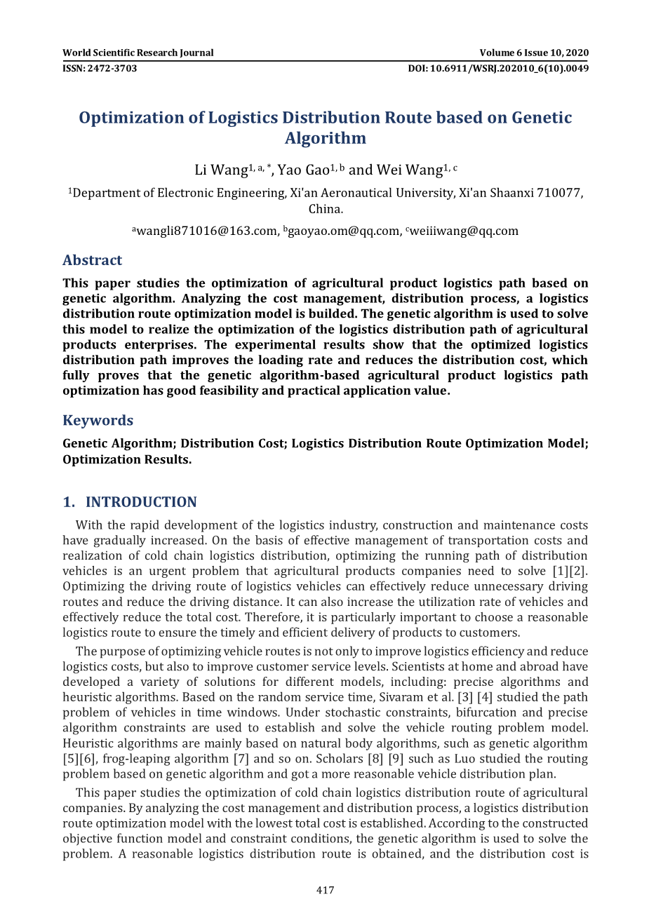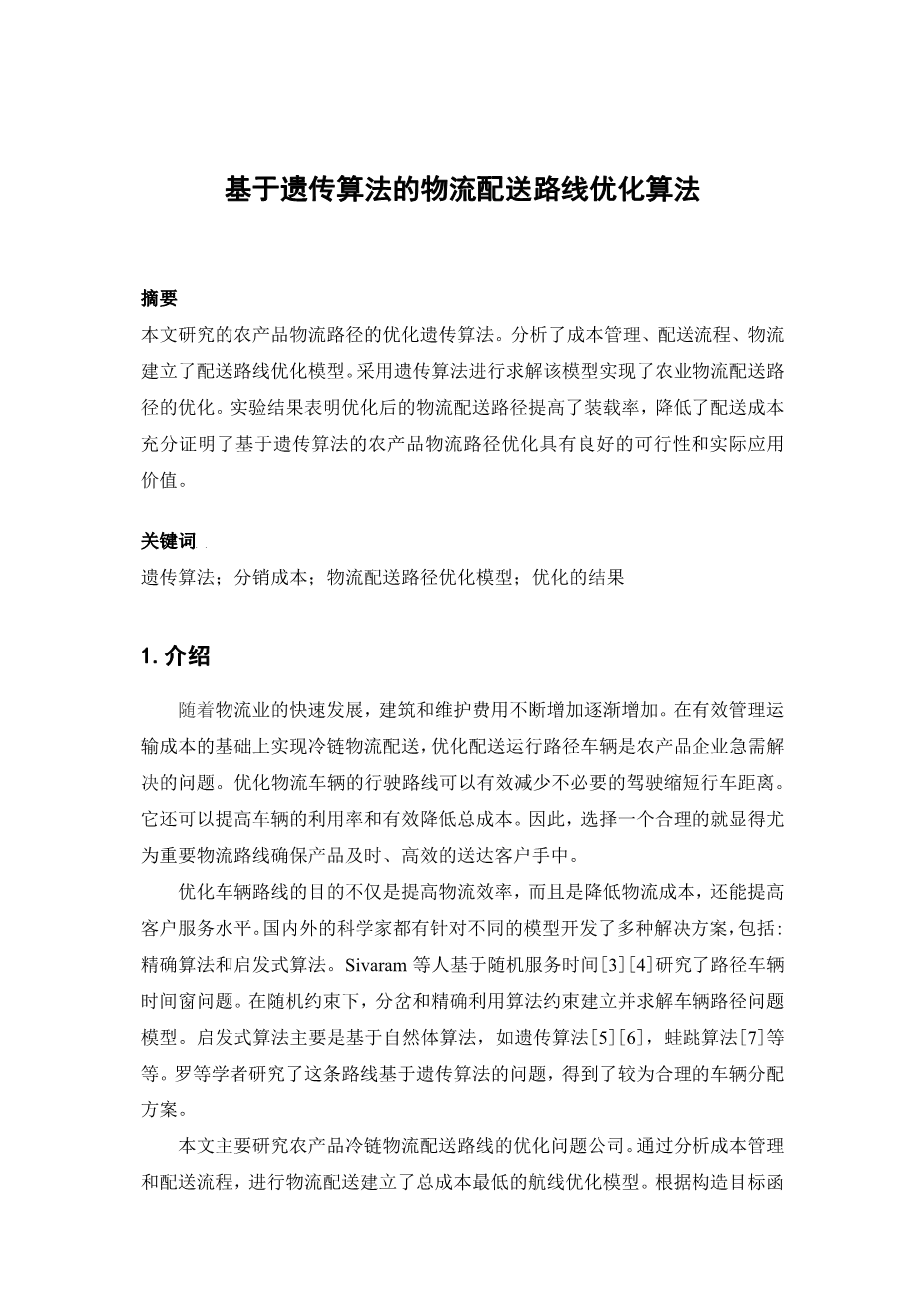 基于遗传算法的物流配送路线优化算法外文翻译资料 2023-08-18 18:42:45 英语原文共 9 页,剩余内容已隐藏,支付完成后下载完整资料 英语译文共 7 页,剩余内容已隐藏,支付完成后下载完整资料 资料编号:[605804],资料为PDF文档或Word文档,PDF文档可免费转换为Word 原文和译文剩余内容已隐藏,您需要先支付 30元 才能查看原文和译文全部内容!立即支付 发小红书推广免费获取该资料资格。点击链接进入获取推广文案即可: Ai一键组稿 | 降AI率 | 降重复率 | 论文一键排版 PREVIOUS NEXT 您可能感兴趣的文章 一种新的需求响应型城市物流配送业务资源动态分配模型外文翻译资料 以T公司为例,根据基于活动的分类改进库存控制和预测外文翻译资料 新零售条件下生鲜食品家庭配送模式研究外文翻译资料 探索大规模定制作为快递行业创新的潜力外文翻译资料 中国的国内快递业发展战略分析外文翻译资料 有效的物流管理物流 :什么是物流?外文翻译资料 运用层次分析法分析供应链管理的绩效评价外文翻译资料 基于分支切割算法定价的带时间窗口的提货和交货问题外文翻译资料 供应链管理中的电子商务物流:实践视角外文翻译资料 第三方物流服务对客户绩效的贡献外文翻译资料