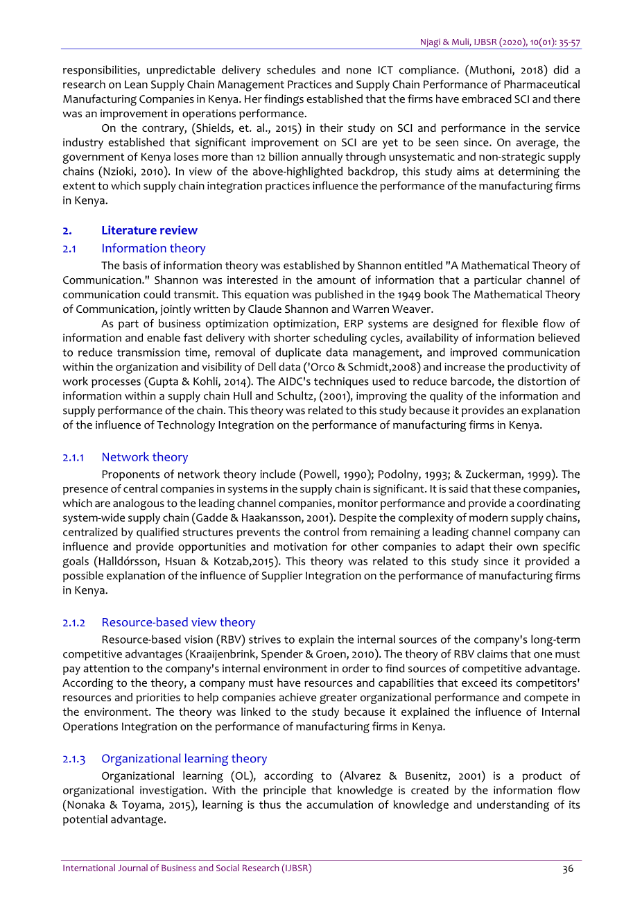 (Nzioka,2010)在他的研究中确定,在肯尼亚经济中,特别是在制造业、卫生和银行部门,采用供应链管理一体化的情况很低,因此组织存在低效和不完整的文件处理、重复的责任、无法预测的交付时间表和不遵守信息和通信技术。(Muthoni, 2018)对肯尼亚制药企业的精益供应链管理实践与供应链绩效进行了研究。她的研究结果表明,这些公司已经接受了SCI,运营业绩也有了改善。