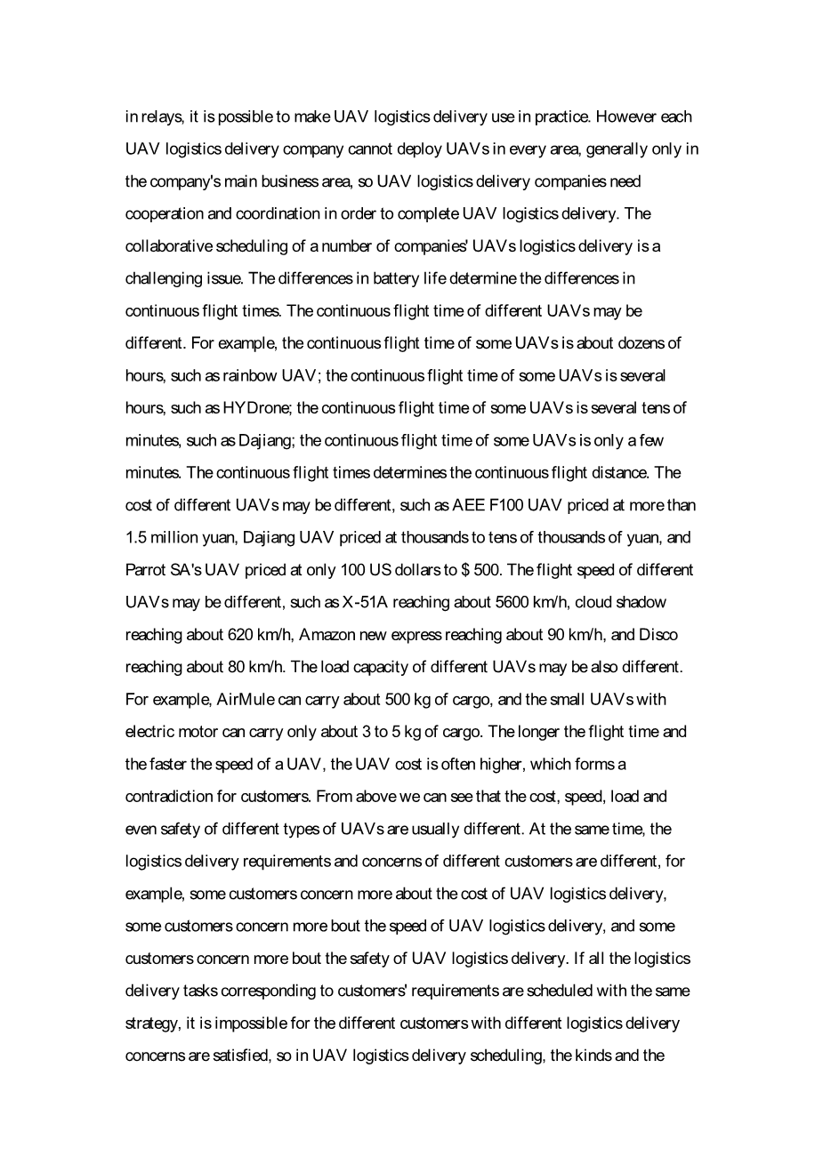 再以无人机物流配送为例,无人机物流配送的距离和负荷都是有限的,这是无人机物流配送面临的最大问题。无人机电池功率的缺点是能量密度低,因此只有当大量无人机以中继方式进行物流配送时,才有可能使无人机物流配送在实际中得到应用。然而,每家无人机物流配送公司并不能在每一个区域都部署无人机,一般只部署在公司的主营业务领域,因此无人机物流配送公司需要合作与协调才能完成无人机物流配送。多家公司无人机物流配送的合作调度是一个具有挑战性的问题。电池寿命的差异决定了连续飞行时间的差异。不同无人机的连续飞行时间可能不同。例如,一些无人机的连续飞行时间大约是几十个小时,如彩虹无人机;部分无人机的连续飞行时间为数小时,如HYDrone;一些无人机的连续飞行时间为几十分钟,如大江;有些无人机的连续飞行时间只有几分钟。连续飞行时间决定了连续飞行距离。不同无人机的成本可能不同,如AEEF100无人机价格在150万元以上,大江无人机价格在数千元到数万元之间,鹦鹉无人机价格在100美元到500美元之间。不同无人机的飞行速度可能不同,如X-51A达到约5600公里/小时,云影达到约620公里/小时,亚马逊新快车达到约90公里/小时,迪斯科达到约80公里/小时。不同无人机的载荷能力也可能不同。例如,航空骡可以携带约500公斤的货物,而带有电动马达的小型无人机只能携带约3至5公斤的货物。无人机的飞行时间越长,速度越快,成本往往越高,这就为客户形成了矛盾。从上面我们可以看到,成本,速度,负载,甚至安全不同类型的无人机通常是不同的。同时,物流交付不同的客户不同的需求和关注的问题,例如,一些客户关注更多关于无人机物流配送的成本,一些客户关注更多无人机物流配送的速度,和一些客户关注更多关注无人机物流配送的安全性。如果所有与客户需求相对应的物流配送任务都采用相同的策略进行调度,则不可能满足具有不同物流配送关注点的不同客户,因此在无人机物流配送调度中,无人机的种类和数量应根据不同客户的个性化需求和关注点来确定,这增加了无人机协同调度问题的难度。