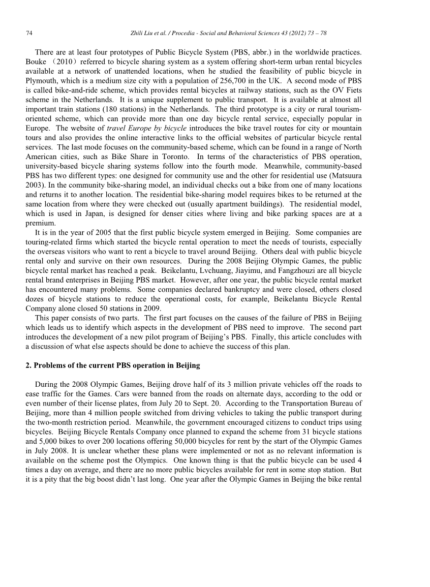 在2008年奥运会期间,北京将300万辆私家车中的一半停驶,以缓解奥运会期间的交通压力。从7月20日到9月20日,根据车牌的奇数或偶数,车辆隔日禁止上路。根据北京市交通局的数据,在两个月的限行期间,超过400万人从驾驶车辆转向乘坐公共交通工具。同时,政府鼓励市民使用自行车出行。北京自行车租赁公司曾计划在2008年7月奥运会开幕前将这一计划从31个自行车站和5000辆自行车扩展到200多个地点,提供5万辆自行车出租。目前还不清楚这些计划是否得到实施,因为奥运会后没有相关信息。但众所周知的是,公共自行车平均每天要被使用4次,而且在一些车站已经没有更多的公共自行车可供出租。但令人遗憾的是,这种大幅增长没有持续太久。北京奥运会一年后,自行车租赁行业就陷入了困境。我们通过对几个自行车站点的调查,总结出公共自行车系统下降的原因,如下所示。