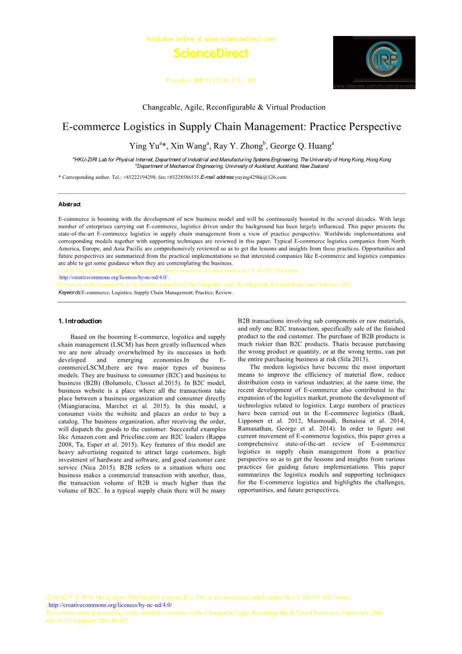随着新的商业模式的发展,电子商务正在蓬勃发展,并将在未来几十年持续发展。随着大量企业开展电子商务,驱动背景下的物流受到了很大的影响。本文从实践的角度介绍了供应链管理中最先进的电子商务物流。本文综述了世界范围内的实现和相应的模型以及支持技术。对北美、欧洲和亚太地区的典型电子商务物流公司进行了全面的回顾,以期从中吸取经验教训和见解。从实际实施中总结出机遇和未来展望,以便电子商务和物流公司等感兴趣的公司在考虑业务时能够获得一些指导。