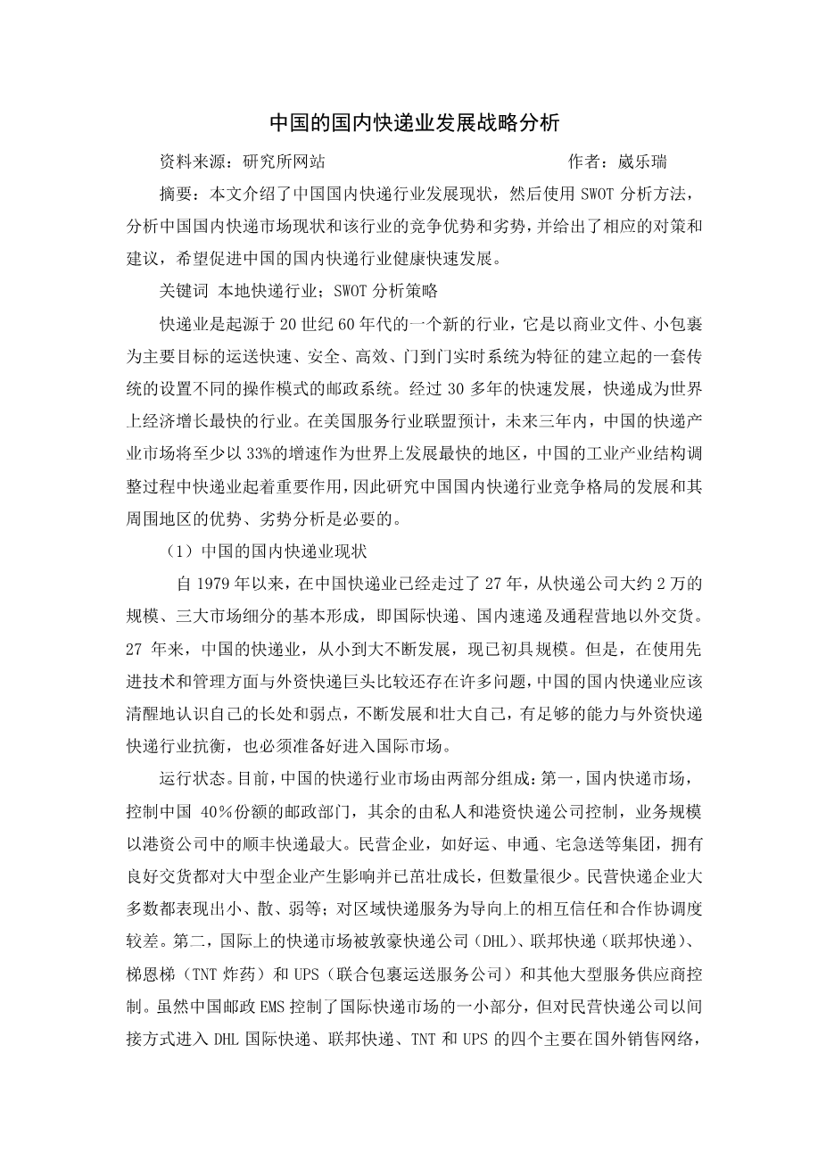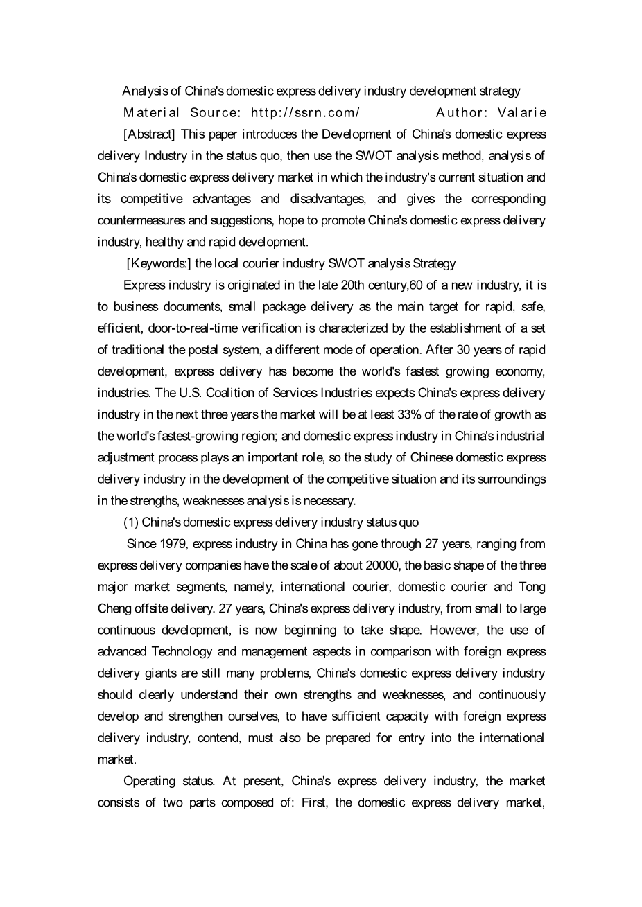 中国的国内快递业发展战略分析外文翻译资料 2023-10-07 15:42:09 英语原文共 6 页,剩余内容已隐藏,支付完成后下载完整资料 英语译文共 5 页,剩余内容已隐藏,支付完成后下载完整资料 资料编号:[609753],资料为PDF文档或Word文档,PDF文档可免费转换为Word 原文和译文剩余内容已隐藏,您需要先支付 30元 才能查看原文和译文全部内容!立即支付 发小红书推广免费获取该资料资格。点击链接进入获取推广文案即可: Ai一键组稿 | 降AI率 | 降重复率 | 论文一键排版 PREVIOUS NEXT 您可能感兴趣的文章 一种新的需求响应型城市物流配送业务资源动态分配模型外文翻译资料 以T公司为例,根据基于活动的分类改进库存控制和预测外文翻译资料 新零售条件下生鲜食品家庭配送模式研究外文翻译资料 探索大规模定制作为快递行业创新的潜力外文翻译资料 中国的国内快递业发展战略分析外文翻译资料 有效的物流管理物流 :什么是物流?外文翻译资料 运用层次分析法分析供应链管理的绩效评价外文翻译资料 基于分支切割算法定价的带时间窗口的提货和交货问题外文翻译资料 供应链管理中的电子商务物流:实践视角外文翻译资料 第三方物流服务对客户绩效的贡献外文翻译资料