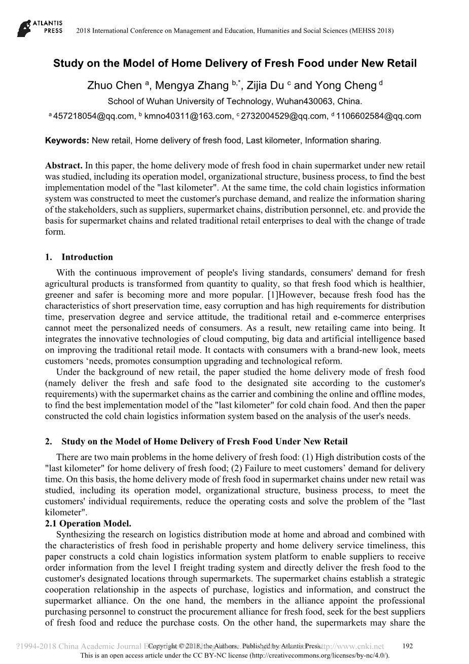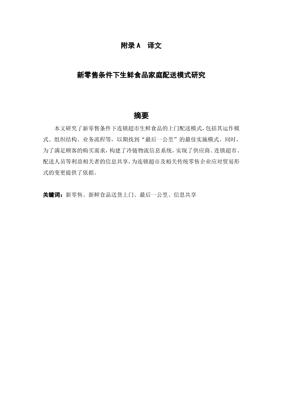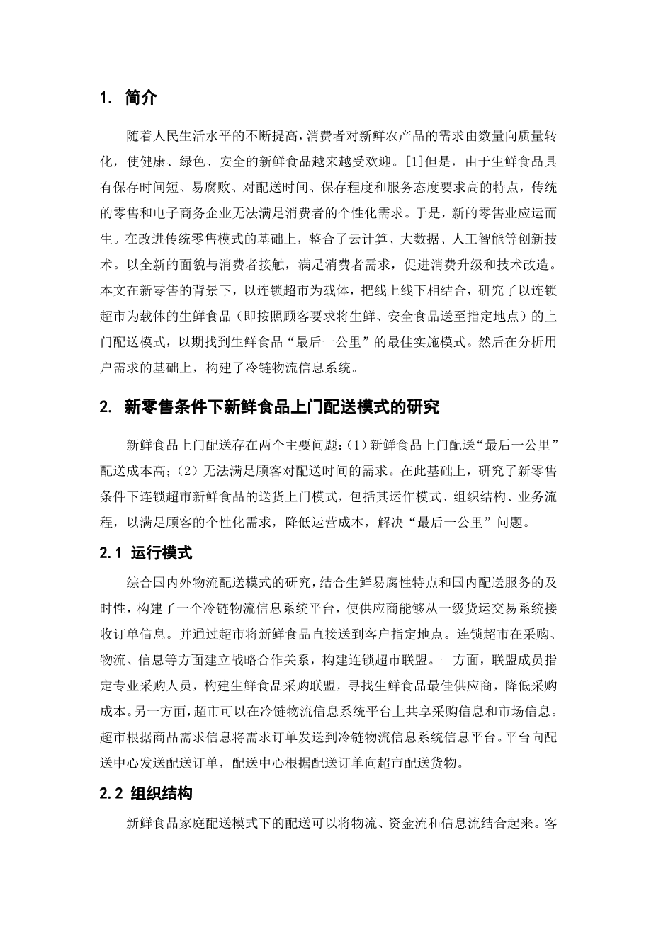 新零售条件下生鲜食品家庭配送模式研究外文翻译资料 2023-10-07 15:42:55 英语原文共 6 页,剩余内容已隐藏,支付完成后下载完整资料 英语译文共 8 页,剩余内容已隐藏,支付完成后下载完整资料 资料编号:[609750],资料为PDF文档或Word文档,PDF文档可免费转换为Word 原文和译文剩余内容已隐藏,您需要先支付 30元 才能查看原文和译文全部内容!立即支付 发小红书推广免费获取该资料资格。点击链接进入获取推广文案即可: Ai一键组稿 | 降AI率 | 降重复率 | 论文一键排版 PREVIOUS NEXT 您可能感兴趣的文章 一种新的需求响应型城市物流配送业务资源动态分配模型外文翻译资料 以T公司为例,根据基于活动的分类改进库存控制和预测外文翻译资料 新零售条件下生鲜食品家庭配送模式研究外文翻译资料 探索大规模定制作为快递行业创新的潜力外文翻译资料 中国的国内快递业发展战略分析外文翻译资料 有效的物流管理物流 :什么是物流?外文翻译资料 运用层次分析法分析供应链管理的绩效评价外文翻译资料 基于分支切割算法定价的带时间窗口的提货和交货问题外文翻译资料 供应链管理中的电子商务物流:实践视角外文翻译资料 第三方物流服务对客户绩效的贡献外文翻译资料