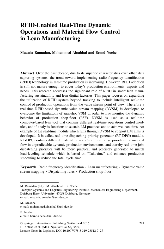 在这一方面,可视性较差的PSF和生产过程中较频繁的干扰(如机器故障、零件意外缺失)都会使准确预测工作进度变得很难。这类像客户订单延迟、物流错误、高水平的在制品(WIP)库存等干扰都会阻碍制造商实现精益目标。此外,许多LM实施方面的专家一致认为精益失败的常见原因倾向于将基于旧状态下的错误及解决方案应用于当前问题(Pavnasker等2013)。这是指PSF上的物理活动与相关信息流之间存在严重的时间间隔,这是由于快照VSM和实时可视性较差造成的(Zhong等,2013)。为了克服这些挑战,射频识别(RFID)被提议出来并支持自动/智能实时数据捕获,旨在填补PSF材料流和操作进度上的时间差并和相关信息流联系起来(Guuml;nther等,2008;Chongwatpol amp; Sharda,2012; Baudin amp; Rao,2015;Blanchard,2009)。此时,RFID取代了条形码和其他基于纸张的数据采集系统,以减少扫描时间相关的人为错误。