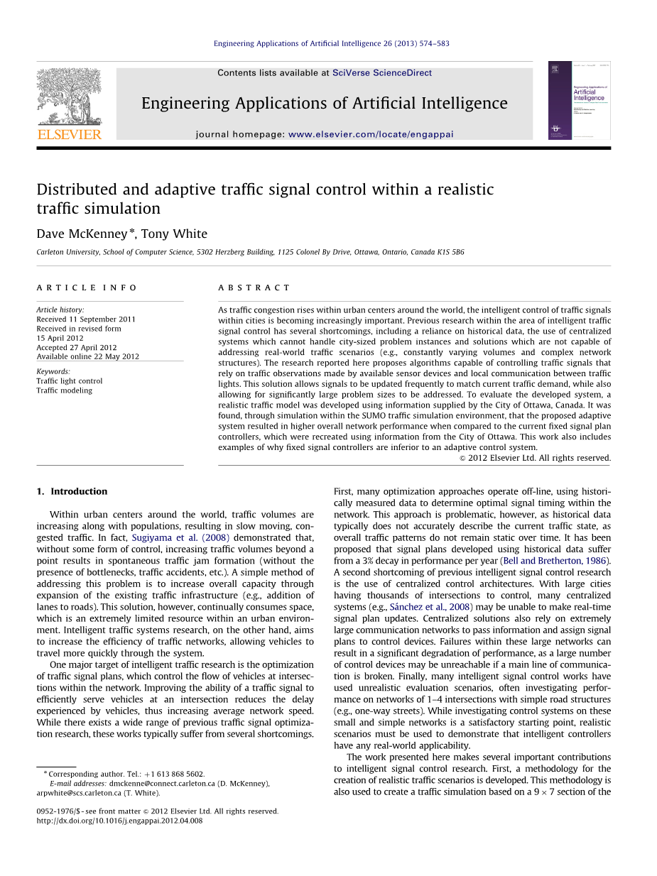 这里介绍的工作对智能信号控制研究作出了一些重要的贡献。首先,它开发了一种用于创建真实交通场景的方法。这种方法还用于创建基于9times;7段渥太华市中心的一个交通仿真。这个模拟使用可用的交通量测量来计算基于预期车辆出入境率和转弯比的路线。这一工作也提出了拥有一些关键特征的控制系统,作者认为这些关键特征十分重要如果这一方案能被用于现实世界。首先文章提出了一种基于agent的方案,这些agent分布式运作而不带有集中控制器,这使得系统能够有效地扩展到非常大的网络。分布式方法也增加了系统的稳健性,因为一个agent的性能只受领近agent的影响(并不是集中控制agent)。如果出现某种故障(例如网络的某个区域停电),受影响区域以外的agent将继续正常运行。系统内的agents依赖于最近观测到的交通数据来适应网络交叉口的信号规划。这确保了交通信号处理当前的交通状态(与历史测量的场景相反)。最终,控制agents只依赖于局部通信和观测,这再次增强了系统的稳健性和可扩展性。因为每个agent只与领近agents通信,一个通信线路的间断最多只能影响2个agents。对于更加复杂的通信网络,一个间断会导致几个agents不能工作。