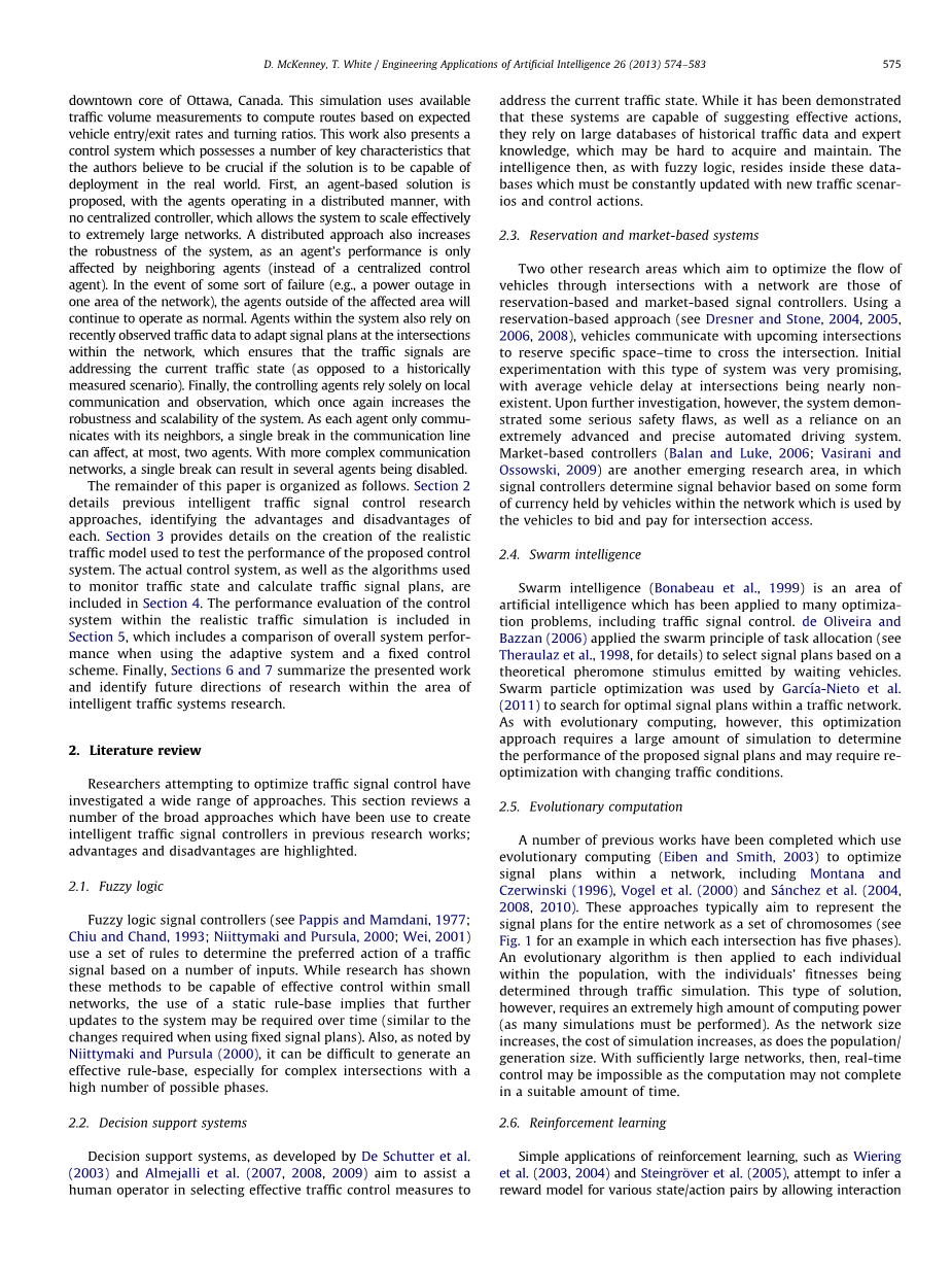 群体智能是一种应用于许多优化问题的人工智能领域,包括交通信号控制。de Oliveira和Bazzan(2006)利用任务分配的群体原理根据等待车辆发出的理论信息素刺激选择信号方案。Garcıacute;a-Nieto等人使用群体粒子优化方法寻找交通网络中的最优信号规划。然而,与进化计算一样,这种优化方法需要大量的仿真来确定所提出的信号计划的性能,并且可能需要随着交通条件的变化进行重新优化。