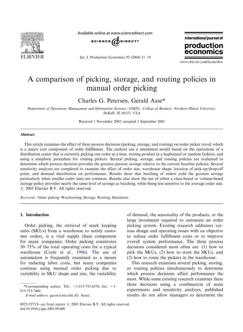 订单拣选,从仓库中检索库存单位(stock keeping units,SKUs)以满足客户订单,是许多公司的重要供应链组成部分。订单拣选占典型仓库总运营成本的50-75%(Coyle et al., 1996).。自动化的使用经常被视为降低劳动力成本的一种手段,但由于SKU形状和尺寸的变化,需求的变化,产品的季节性或自动化订单拣货系统所需的大量投资,许多公司继续使用手动订单拣货。现有研究针对各种设计和操作问题,旨在降低订单履行成本或提高整体系统性能。最常考虑的三个流程决策是:(1)如何选择SKUs,(2)如何存储SKUs,以及(3)如何在仓库中路由拣货员。此研究同时检查多个拣货,存储或路由策略,以确定哪些流程决策对性能的影响最大。虽然一些现有研究使用主要实验和敏感性分析相结合的方式检验这三个决策,但已公布的结果不能使管理者确定三个决策的相对重要性。该研究将促进关于订单履行绩效的这种比较。换句话说,管理者将能够确定哪个决策提供了最大的“帮助”。企业是否应该实施订单分批,最佳路由,基于体积的存储或这些策略的某种组合?本文最后讨论了关于三项决定相对重要性的管理影响。