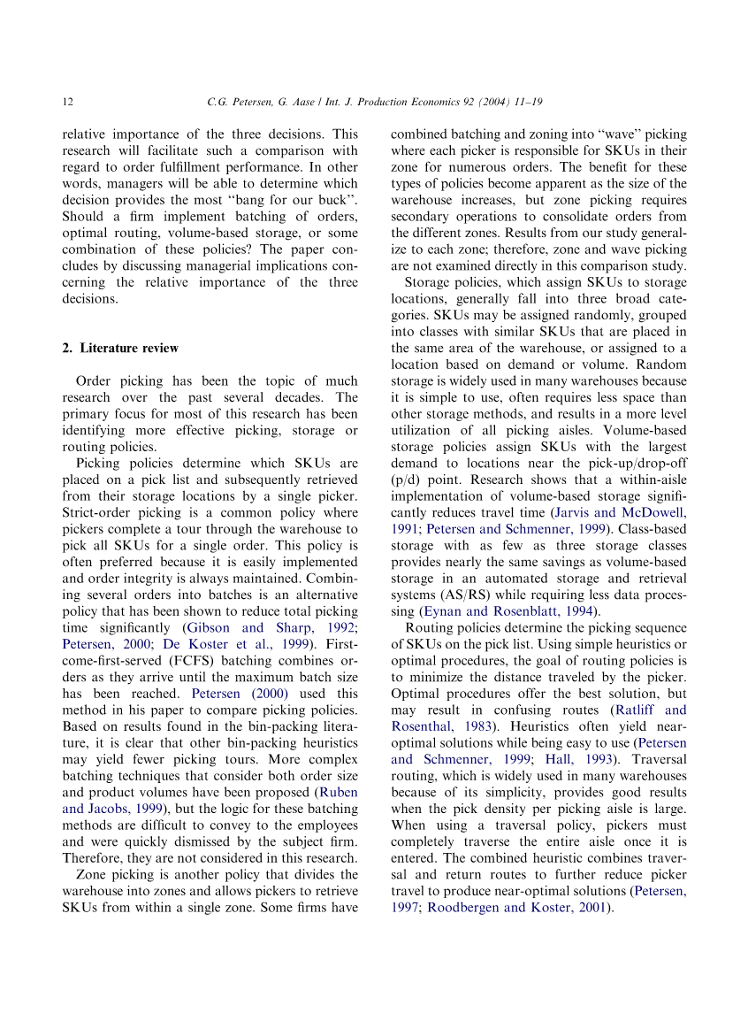 将SKUs分配到存储位置的存储策略通常分为三大类。SKUs可以随机分配,按相似SKUs分组,这些SKUs放置在仓库的同一区域中,或者根据需求或体积分配到位置。随机存储在许多仓库中被广泛使用,因为它易于使用,通常比其他存储方法需要更少的空间,并且使所有拣选通道有更高级利用率。基于体积的存储策略将把需求最大的SKUs分配到打包点附近的位置。研究表明,基于体积的存储策略的内部通道实施大大减少了拣货时间(Jarvis和McDowell,1991; Petersen和Schmenner,1999)。基于类别的存储只需三个存储类,在自动存储和检索系统(AS / RS)中与基于体积的存储节省量几乎相同,同时需要较少的数据处理(Eynan和Rosenblatt,1994)。