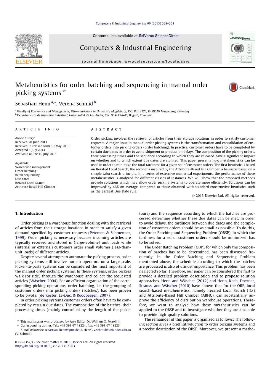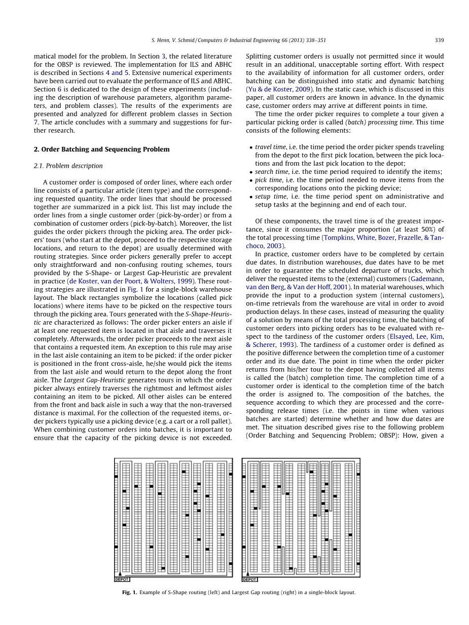 本文采用Rosenwein[3]中顺序分批的术语。物品是仓库产品的唯一标识符。每个项目都分配到仓库中的唯一位置。行项是客户对特定数量的特定项目的请求。顾客订单是客户对一个或多个行项目的需求。采摘功能包括-一个拾取器(器皿房操作员)和/或一台S/R机器,它穿过仓库内的过道,并从仓库设备中提取物品。选择器选择与一个或多个订单(批次)相关的所有行项目。通常情况下,将几个小订单组合成一个更大的批次在劳动力方面是更好的。