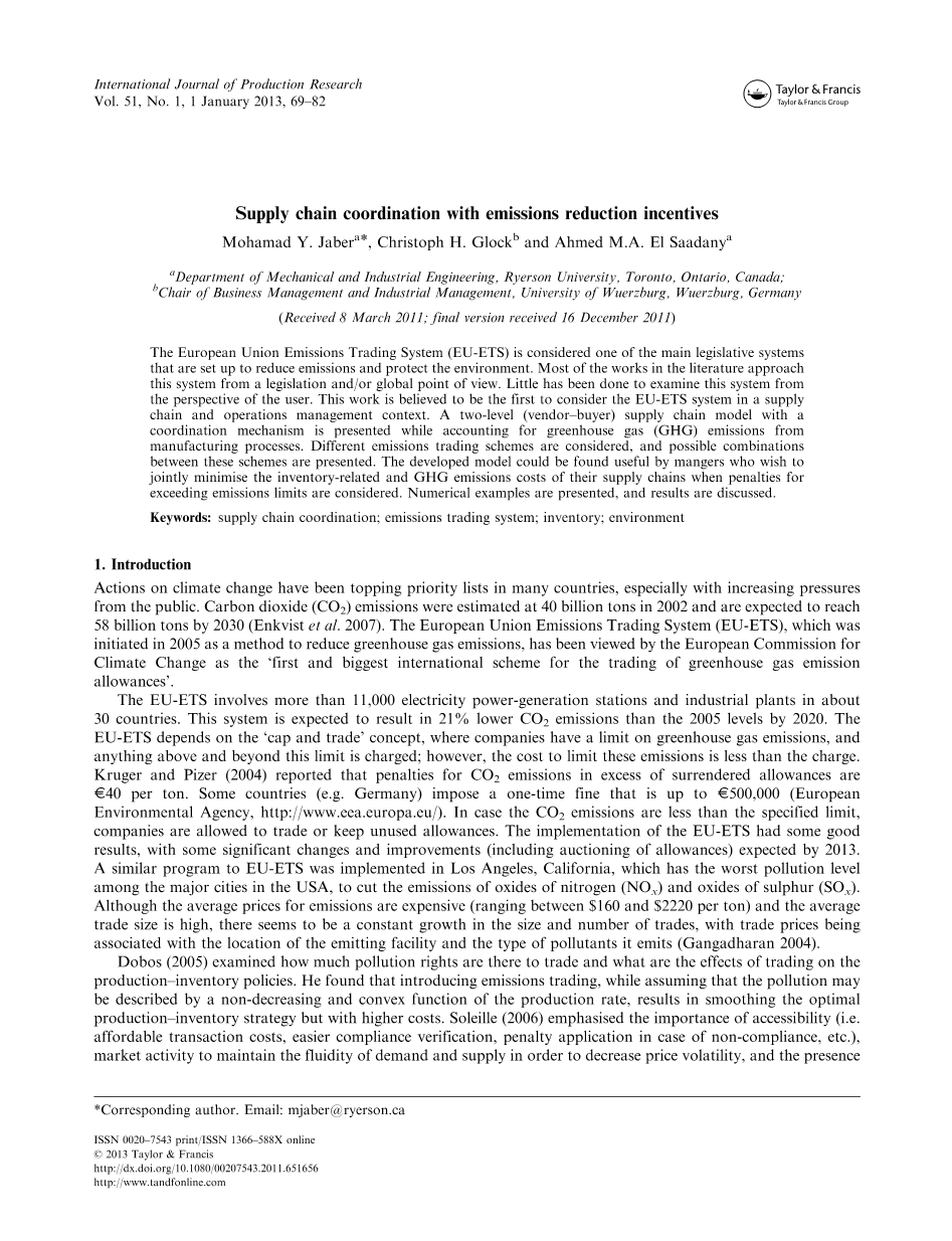 欧盟排放交易体系(EU-ETS)被认为是为减少排放和保护环境而建立的主要立法体系之一。大多数文献从立法和/或全球的观点来探讨这一制度。很少有人从用户的角度来研究这个系统。这项工作被认为是第一个在供应链和运营管理上下文中考虑EU-ETS系统的工作。在考虑制造过程温室气体排放的同时,提出了一个具有协调机制的两级供应链模型。考虑了不同的排放交易方案,并提出了这些方案之间的可能组合。当考虑到超过排放限制的处罚时,希望共同将供应链中与库存相关的和温室气体排放成本降至最低的管理者可以发现,所开发的模型是有用的。给出了算例,并对结果进行了讨论。