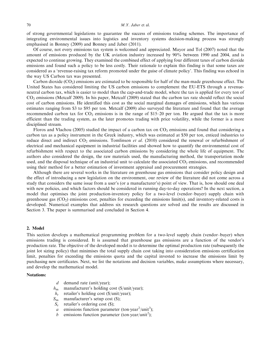 虽然有一些关于温室气体排放的文献考虑了政策设计和引入新的环境立法的影响,但我们对这些文献的回顾并没有遇到从用户(或制造商)的角度考虑相同问题的研究。也就是说,如何处理新政策,在日常运营中应该考虑哪些因素?在下一节中,将为温室气体(CO2)排放成本、超过排放限额的处罚和库存相关成本的两级(供应商—买方)供应链优化联合生产—库存政策的模型。第3节给出了解决六个研究问题的数值例子,并对结果进行了讨论。第四部分对全文进行了总结和总结。
