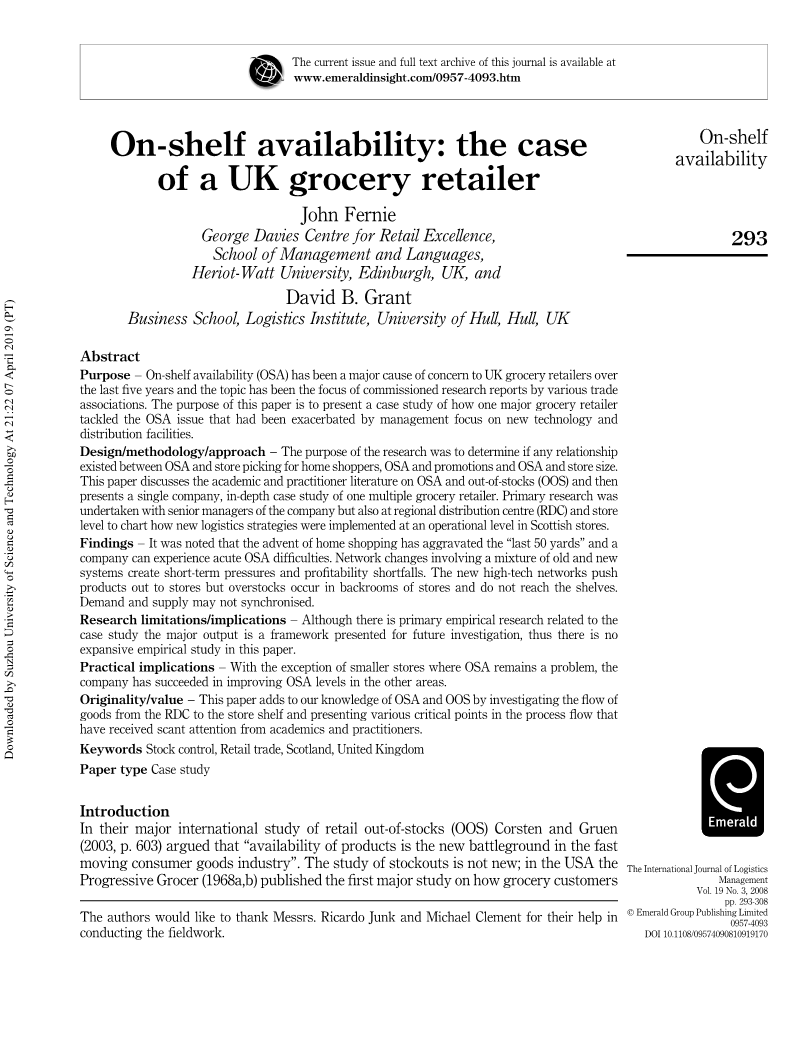 设计/方法研究的目: 确定OSA与家居购物、OSA和促销以及OSA和商店规模之间是否存在任何关系。本文讨论了关于OSA和缺货(OOS)的学术和实践文献,然后介绍了一个单一的公司,在一个多杂货店零售商深入的案例研究。初步研究 与公司高级管理人员合作,并在区域分销中心(RDC)和商店一级制定新的物流战略是如何在苏格兰的业务层面实施的商店。