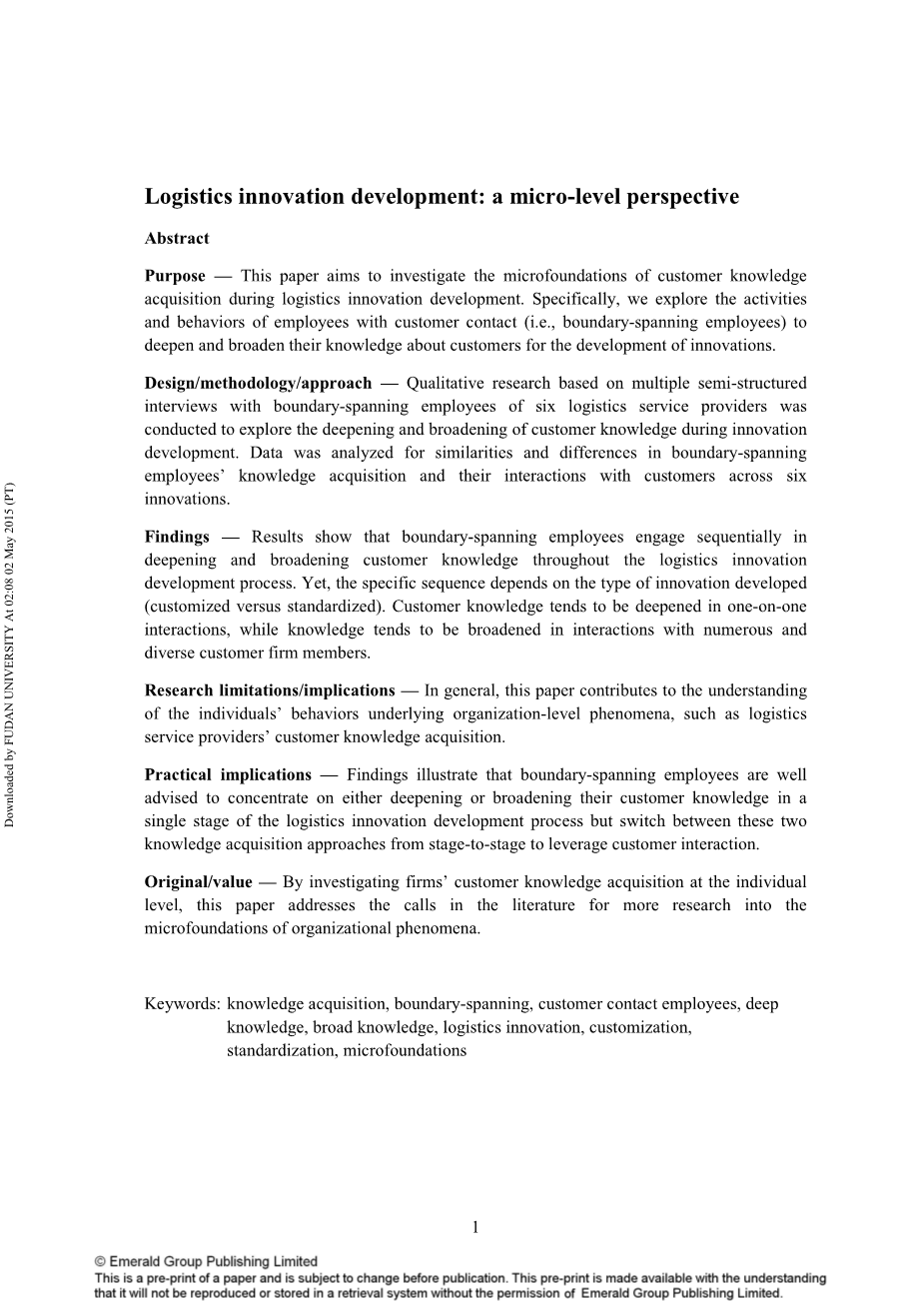 虽然现存的创新研究将外部知识获取作为一种组织现象,但它源于个体行为(Felin和Hesterly,2007; Gupta等,2007)。 Nonaka和Konno(1998)讨论了知识创造的等级,因为一旦个人加入团队,个人的知识就会被集体所接受。反过来,团队的知识也嵌入在组织中。因此,个人包括在创新团队和组织的更大背景下创建知识的微观基础。其他实证研究表明了BSE在创新发展中的重要性,因为它们可以识别客户需求,触发创新,促进和执行物流创新(例如,Panayides,2007; Wagner和Sutter,2012)。因此,BSE可以在获得深入和广泛的客户知识化物流创新发展中发挥关键作用。因此,关于对创新成功至关重要的微观基础的知识是必要的(例如,Vermeulen等人,2007)。如果没有这些知识,研究就会冒着测试不符合基本理论概念的命题的风险。因此,我们研究了BSE如何以及何时在物流创新发展过程中深化和拓展客户知识。