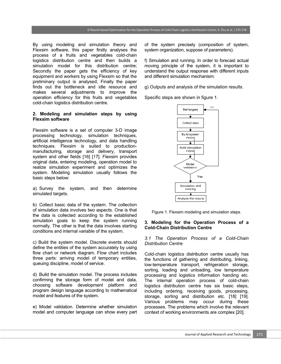 目前,关于冷链物流配送中心的研究尚处于初期阶段。国内外专家主要关注配送模式选择[6] [7],基于VRP方法的路径选择[8],存储和拣选方法[9]等,主要涉及冷链物流配送中心的子系统。然而,关于冷链配送中心整体过程的研究很少。同时,国内冷链物流配送中心存在运输过多,自动化程度低,布局规划不合理,配送流程复杂等问题[10]。它利用建模仿真理论和Flexsim软件,首先分析了果蔬冷链物流配送中心的过程,然后建立了该配送中心的仿真模型;其次,利用Flexsim对关键设备和工人的效率进行了分析,从而对初步输出进行了分析;最后,本文找出了瓶颈和闲置资源,并进行了几项调整,以提高该果蔬冷链物流配送中心的运行效率。